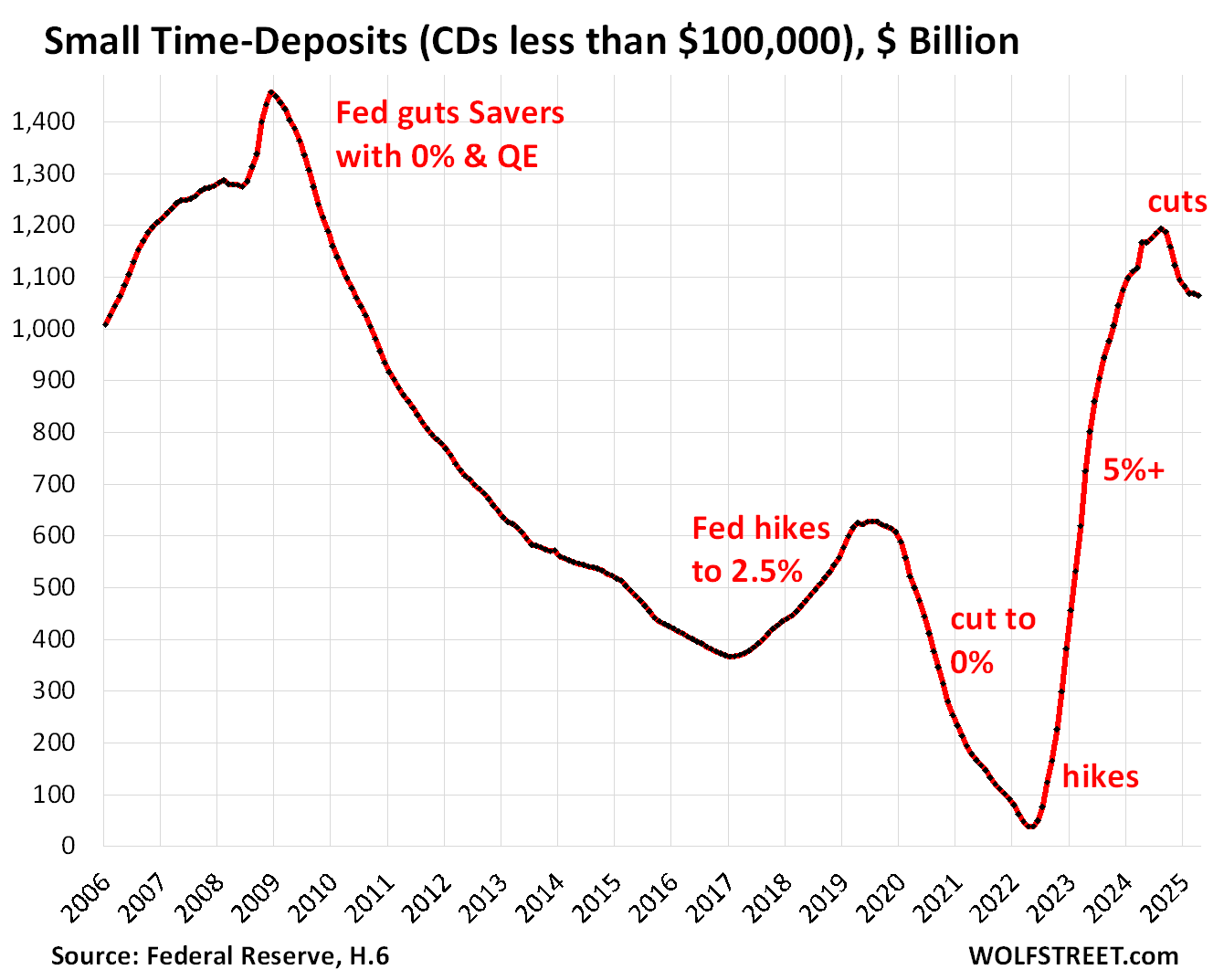Small Time-Deposits (CDs of less than $100,000) have remained essentially unchanged at $1.06 trillion over the three months through April, after dropping from their highs in August 2024 of $1.19 trillion, according to the Fed’s latest Money Stock Measures.