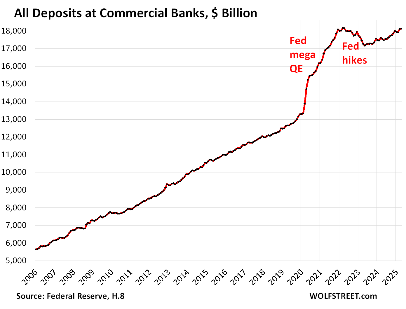 But CDs are only a small part of bank deposits. Total deposits at commercial banks are currently at $18.1 trillion, back where they’d been before the rate hikes. But they did drop by about $1 trillion from early 2022 through early 2023 as competing interest rates rose, and customers yanked their cash out. Higher deposits rates by banks then stopped the outflow and brough the cash back in.