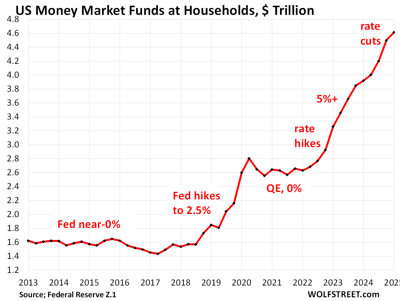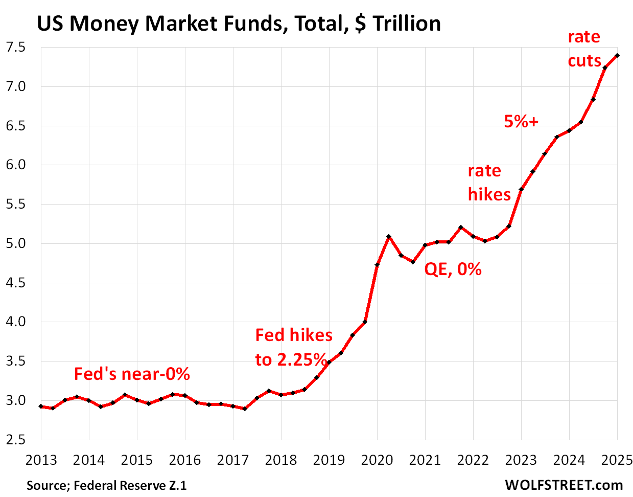 A narrative floating on the info highway, is that the longterm impact of high deficits, tariffs and general inflation, with a lower dollar, will greatly erode the future value of cash sitting in these money mkt funds (as well as standard US index funds).