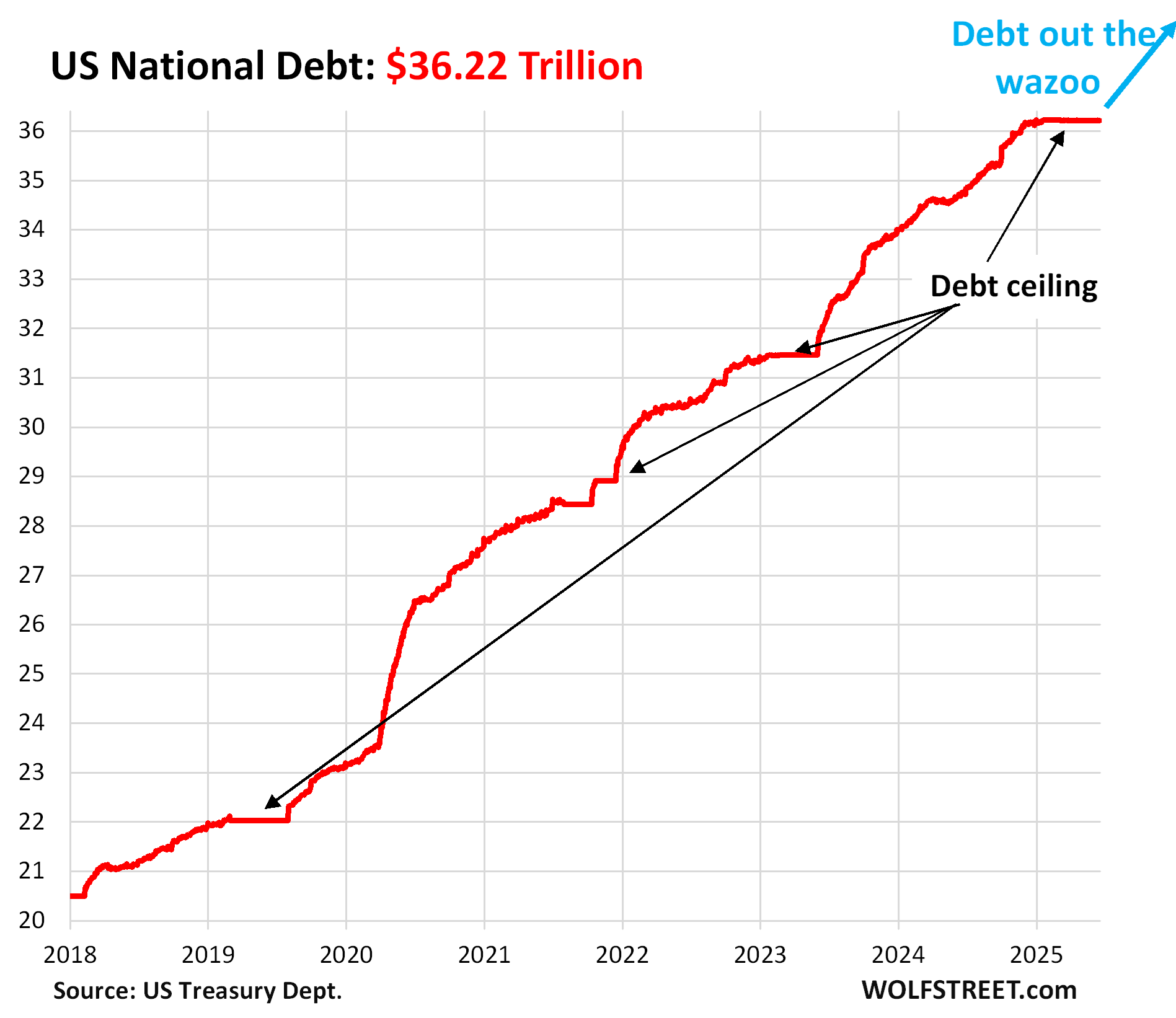 The US debt has been stuck at the “debt ceiling” of $36.2 trillion since January. After Congress makes a deal with itself to raise the debt ceiling, the debt will spike by hundreds of billions of dollars as the government shifts money around and issues huge amounts in T-bills to refill its depleted checking account. In the chart, the flat parts followed by spikes show that dynamic.
