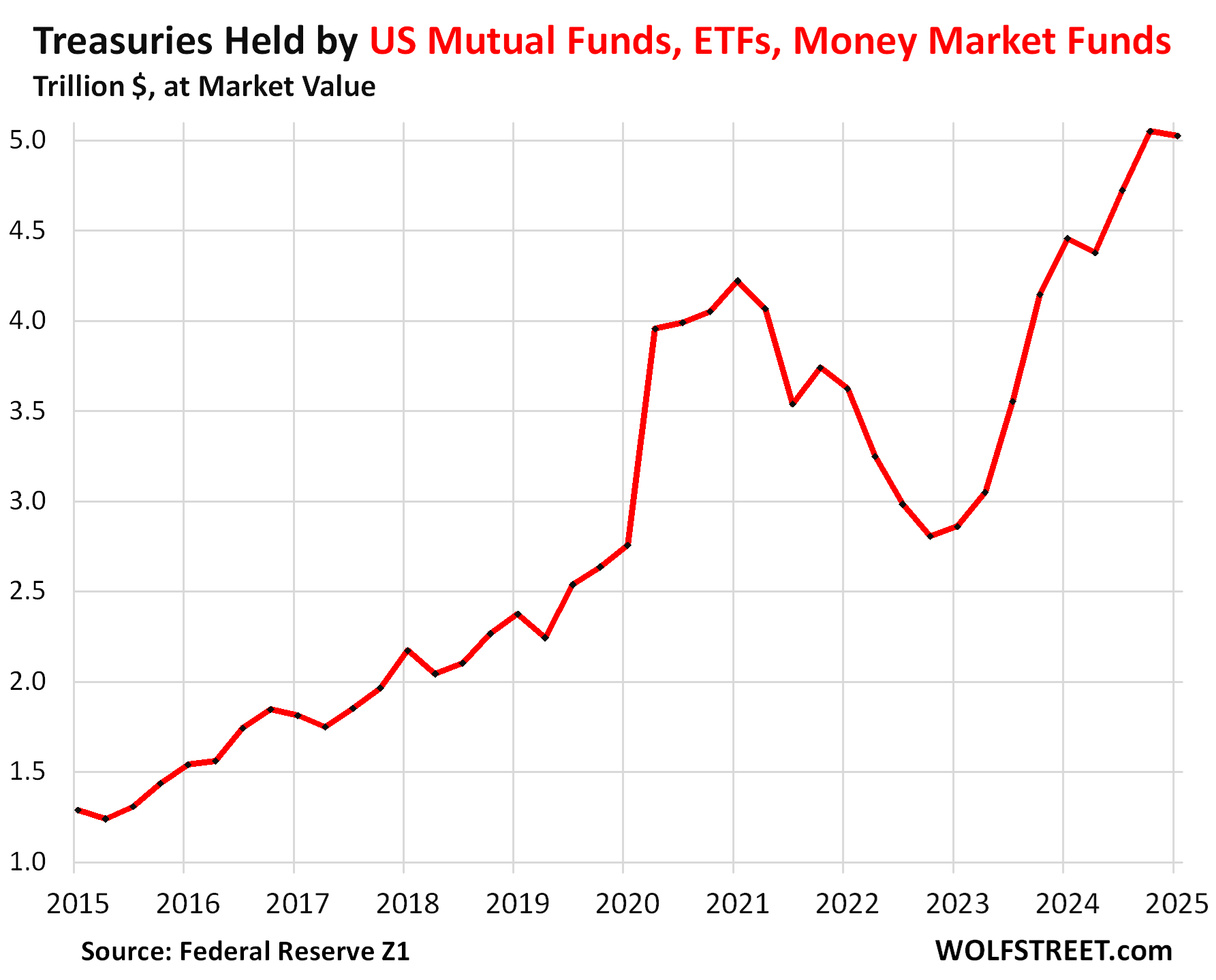 US mutual funds, ETFs, and money market funds held $5.02 trillion at the end of Q1 at market value, or 18.7% of the debt held by the public.