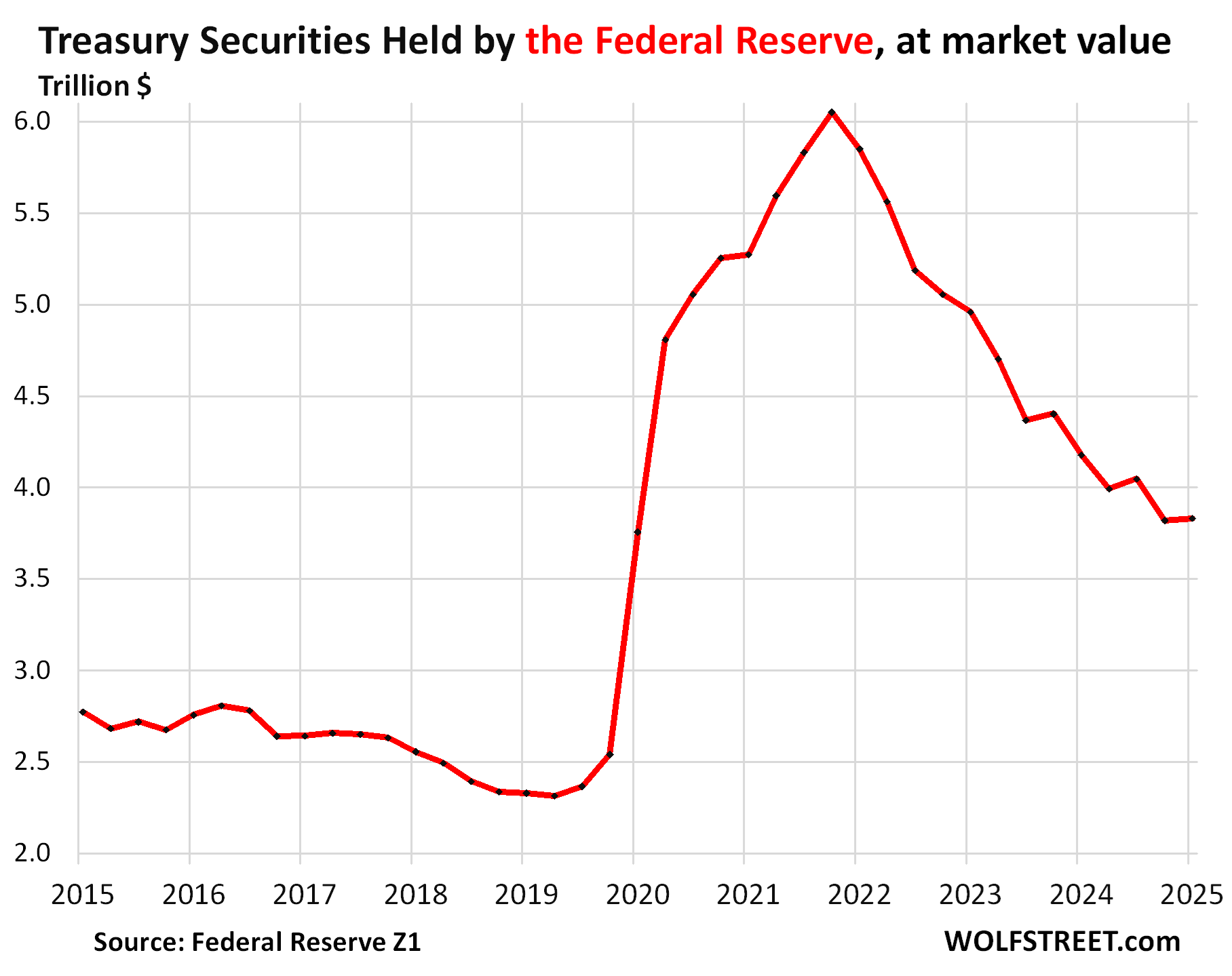 But at market value, the Fed’s holdings of Treasuries declined by $2.22 trillion since mid-2022, on this mix of QT and lower market value of its remaining holdings.