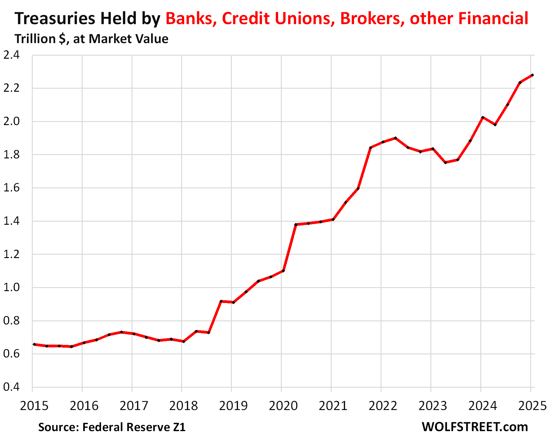 Banks alone held $1.54 trillion and securities brokers and dealers held another $488 billion. They’ve had a relentless appetite for Treasuries, come hell or high water: