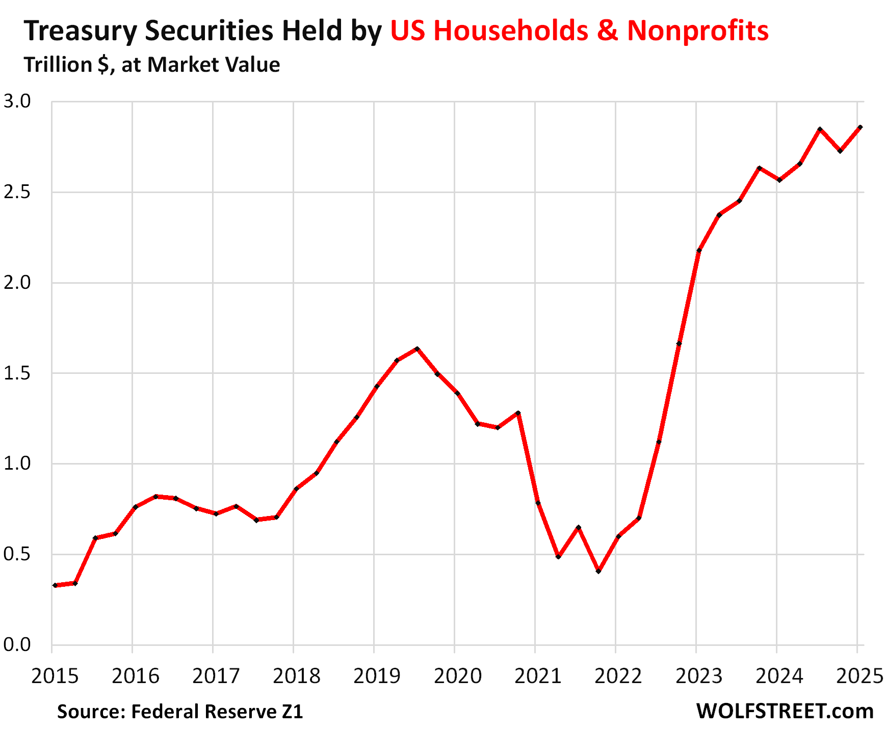 US Households and nonprofits held $2.86 trillion of Treasury securities at market value, or 10.6% of the debt held by the public. They too were the smart money, doing what insurance companies did.