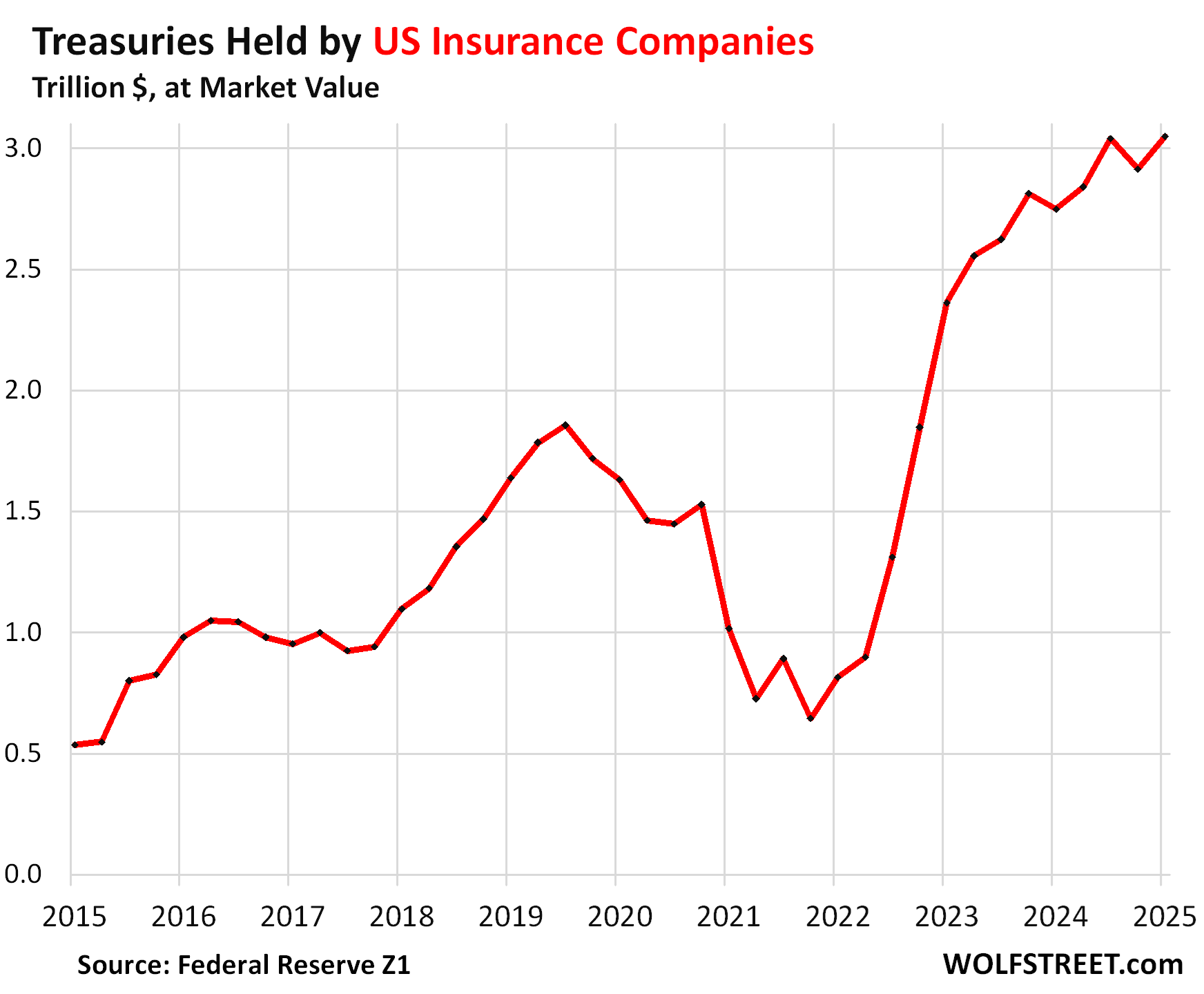 Insurance companies held $3.05 trillion of Treasury securities at market value, or 11.3% of the debt held by the public, of which property and casualty insurance companies held $2.86 trillion and life insurers held $191 billion.