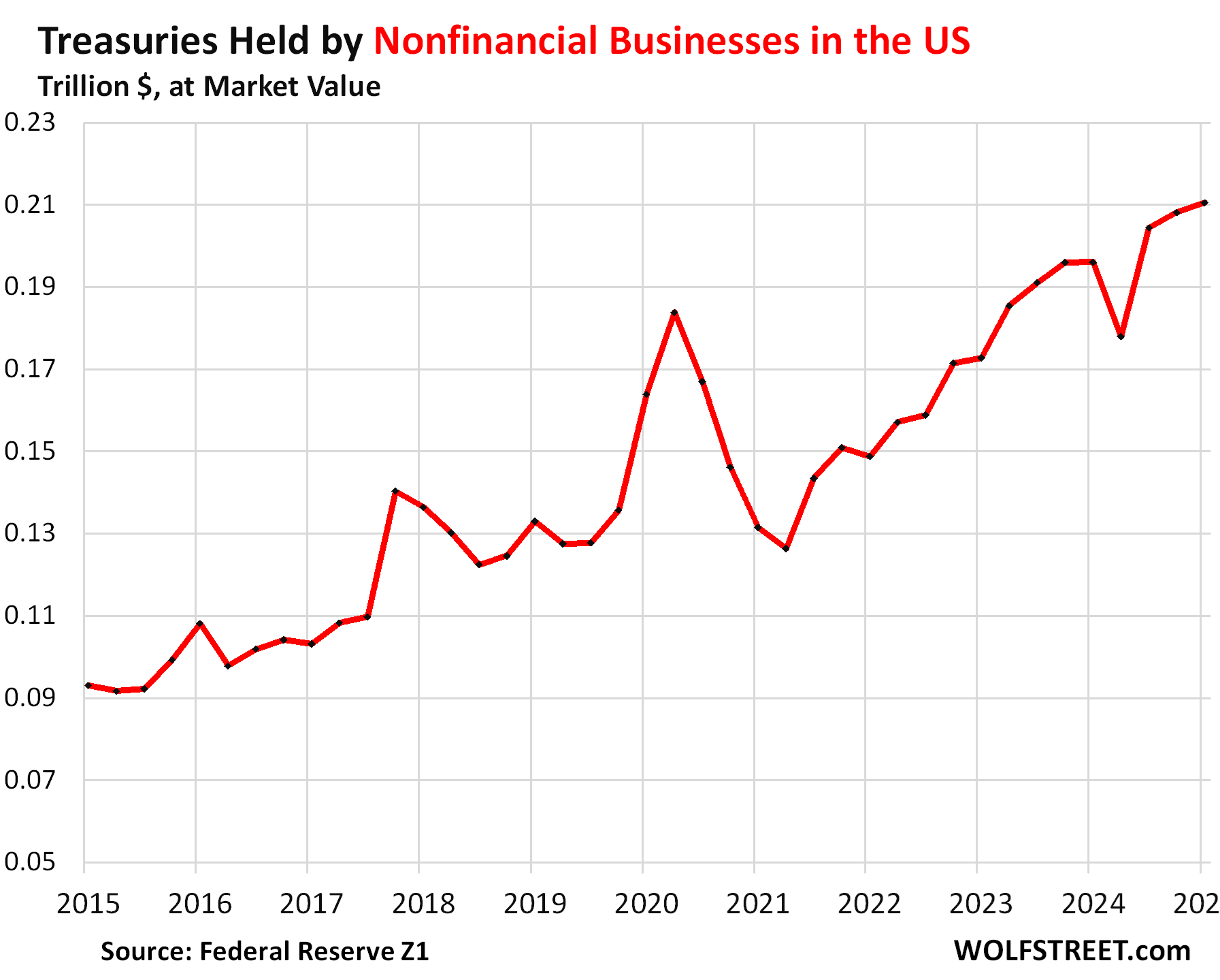Nonfinancial businesses held $210 billion of Treasury securities at market value, or 0.9% of the debt held by the public. This includes corporate and noncorporate businesses.