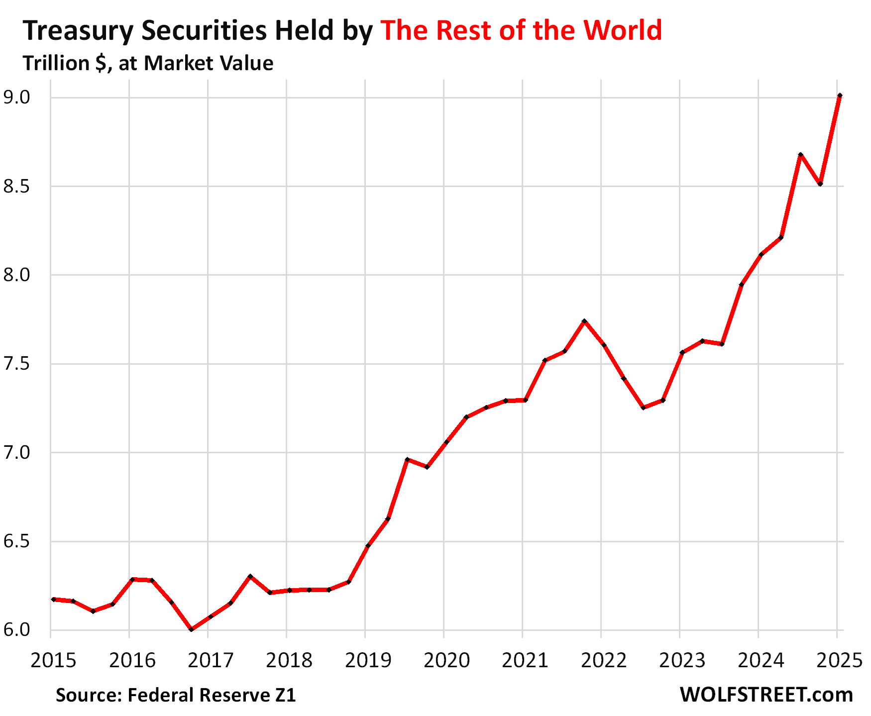 Foreign holdings at market value reached $9.01 trillion at the end of Q1, or 33.5% of the debt held by the public at market value, according to the Fed’s Z1 data, indicating strong demand from foreign holders.