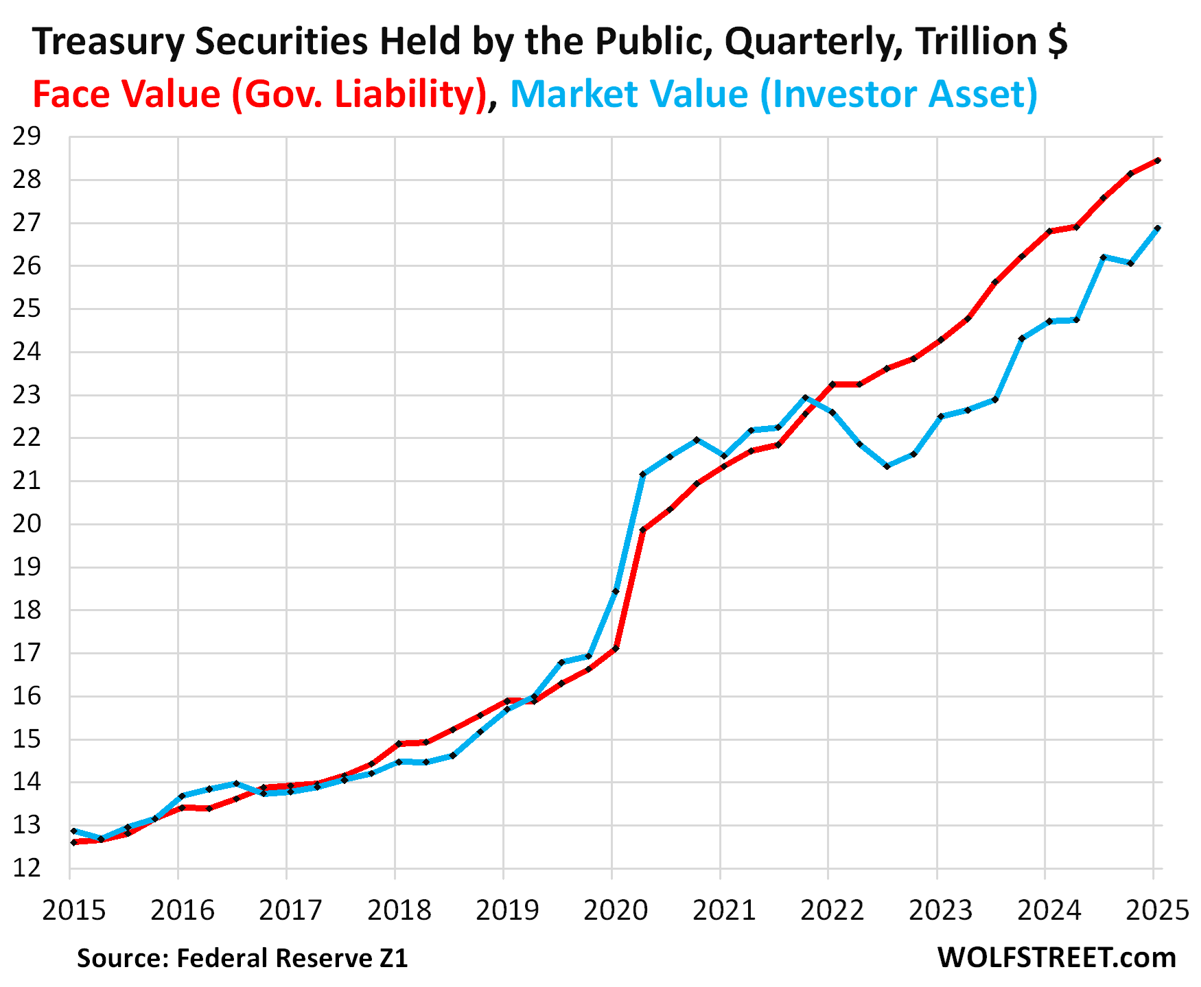 But seen from the holders’ point of view as an asset, the same debt held by the public had a market value of $26.88 trillion, also according to the Z1 data from the Federal Reserve (blue in the chart).