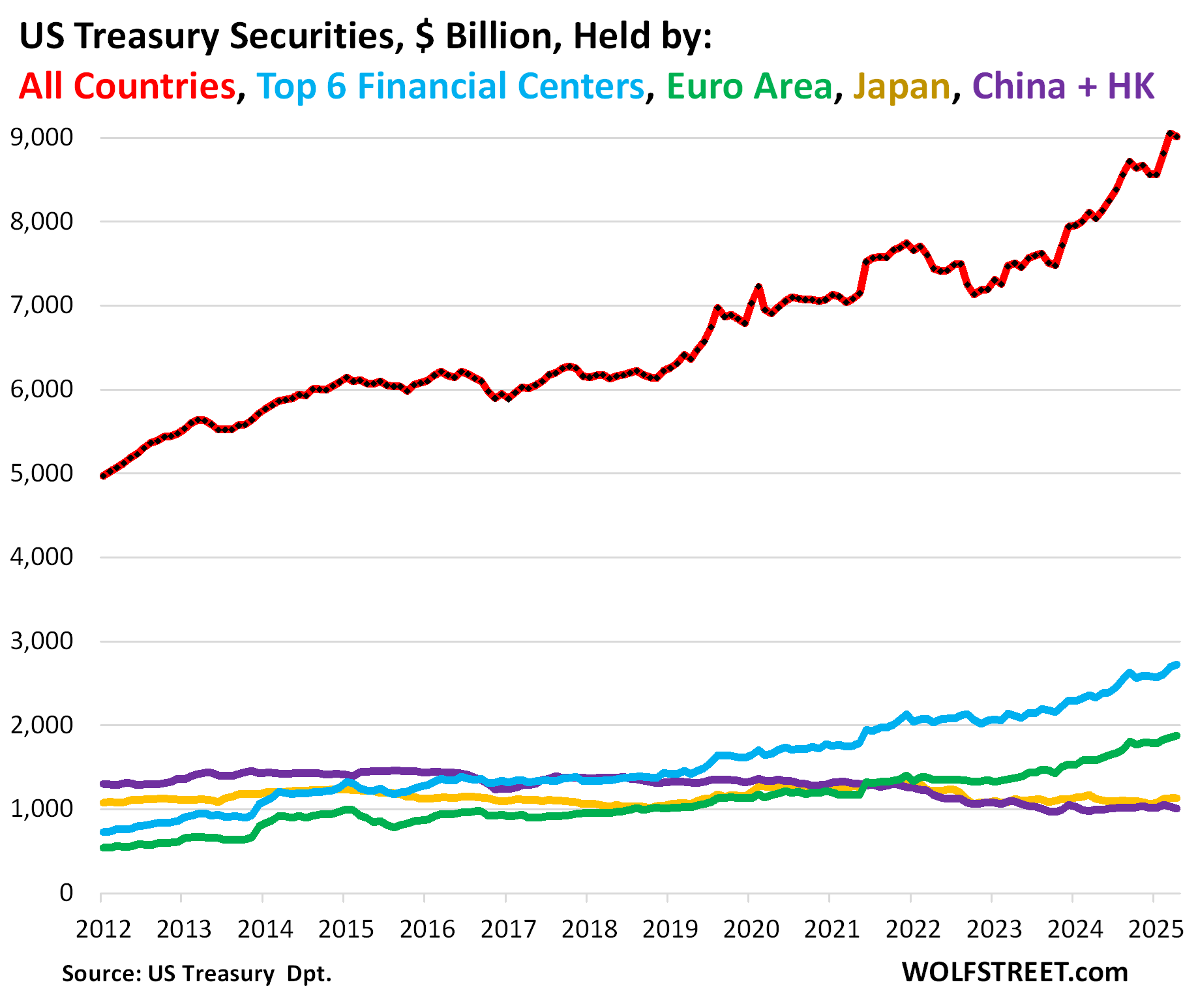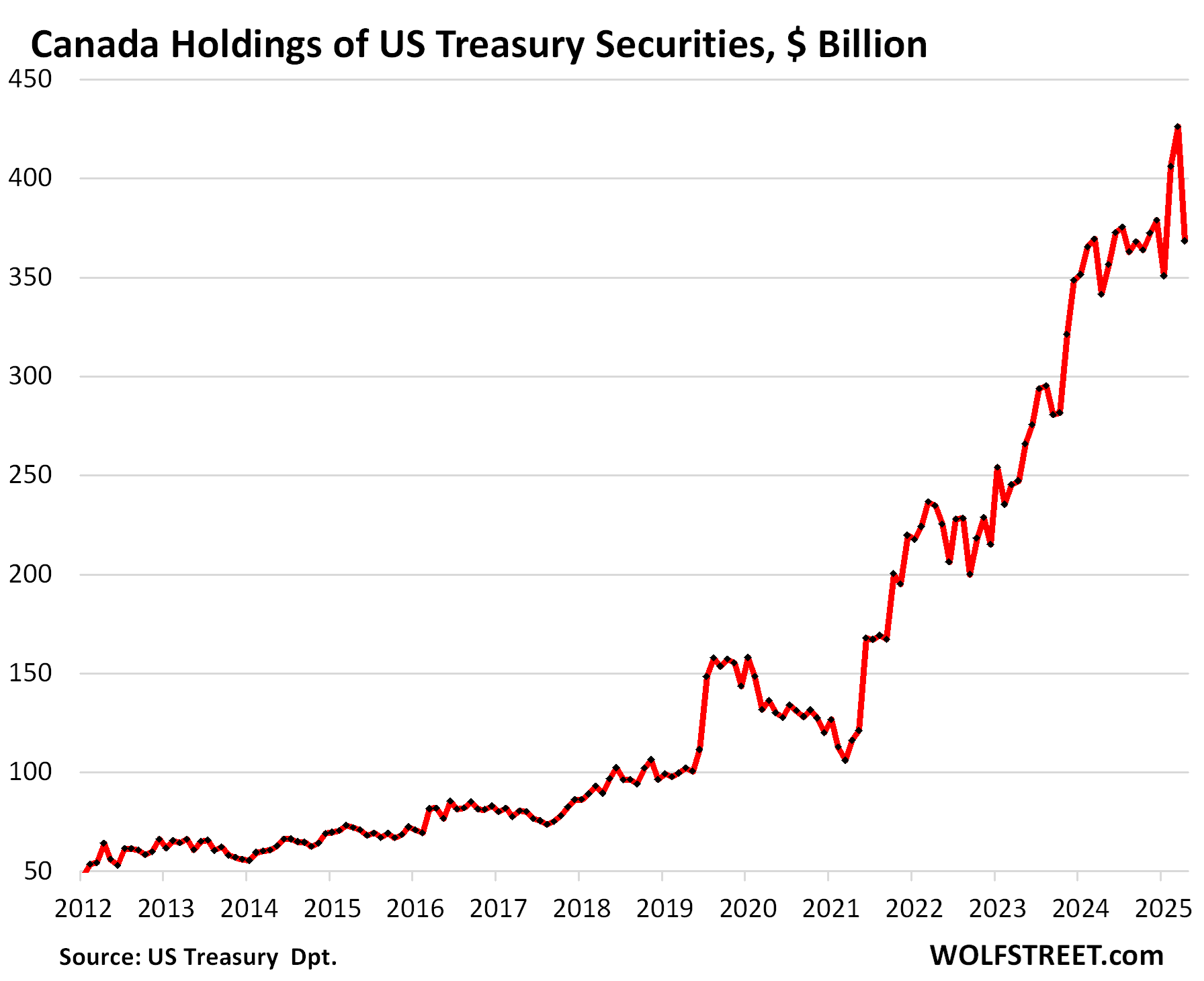 But in April, Canada shed $58 billion, and total holdings plunged to $368 billion, back to February 2024 levels. That was a historic plunge – not surprising though.