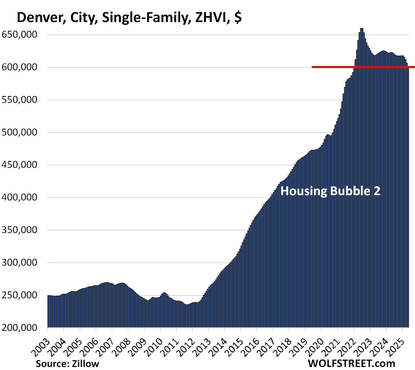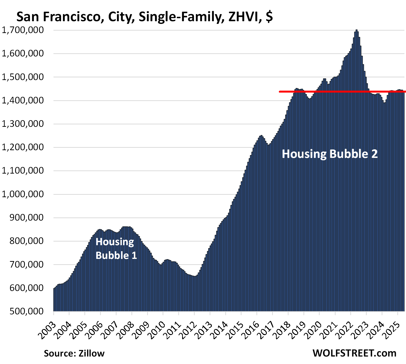 These prices here are seasonally adjusted three-month moving averages of “mid-tier” single-family homes in “cities” – not in metros, or Metropolitan Statistical Areas. The values are from the Zillow Home Value Index (ZHVI), which is based on millions of data points in Zillow’s “Database of All Homes,” including from public records (tax data), MLS, brokerages, local Realtor Associations, real-estate agents, and households across the US. It includes pricing data for off-market deals and for-sale-by-owner deals. These are not median prices.