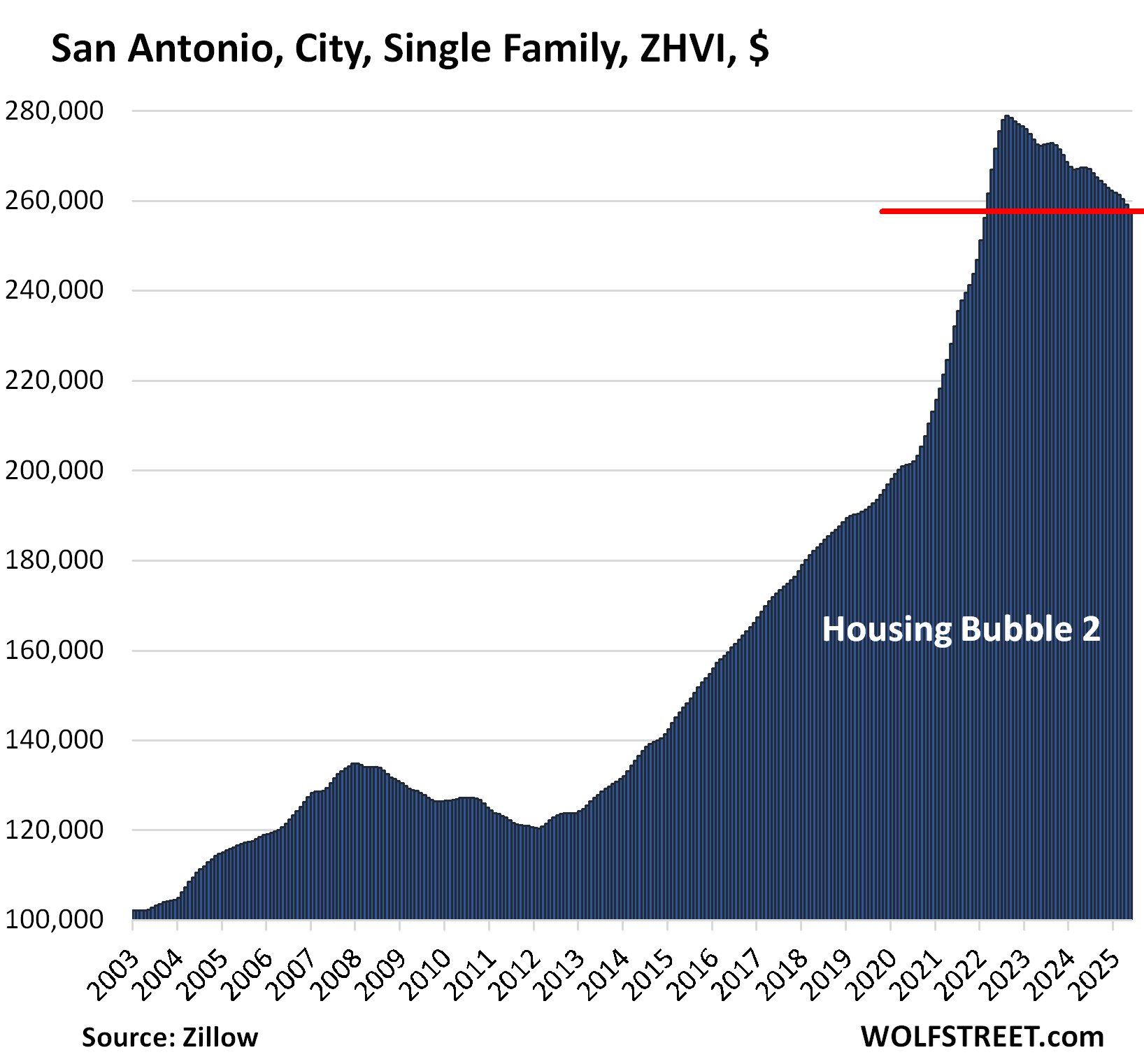The cities in Texas didn’t experience much of a Housing Bubble 1, and Housing Bust 1 was therefore relatively mild. But this changed with Housing Bubble 2.