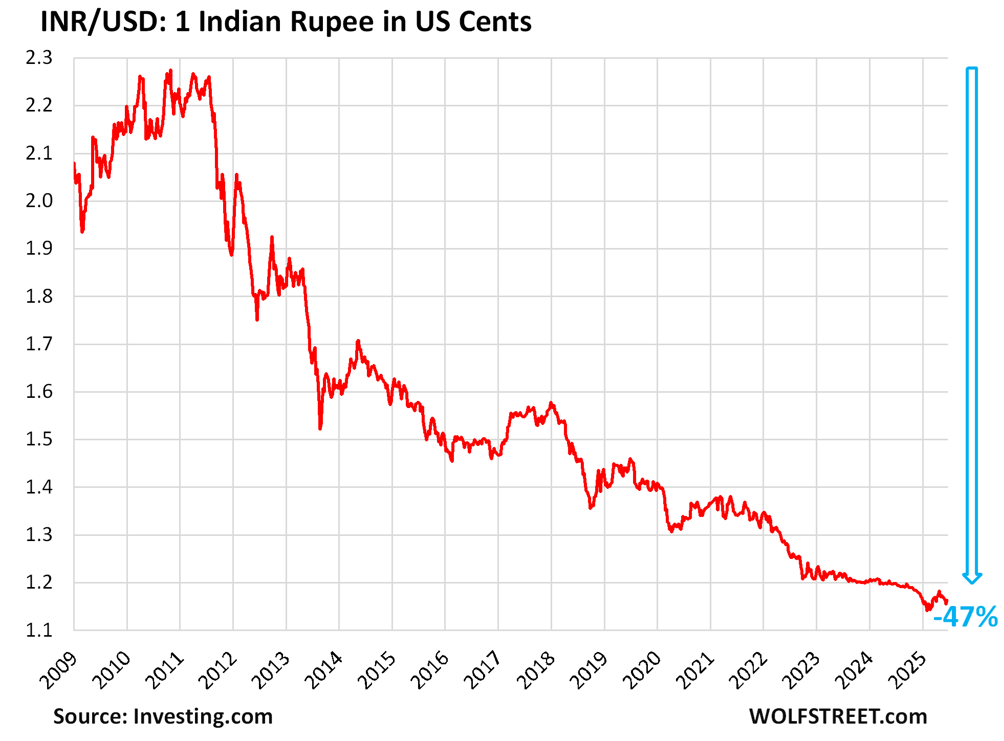 The Indian rupee [INR] has dropped to 1.16 US cents, down about 47% from the range in 2010. So this is in line with the collapse of the yen that had set the world atwitter, except for the rupee, it was just the normal progression of a currency of a developing economy, and it wasn’t a big deal.