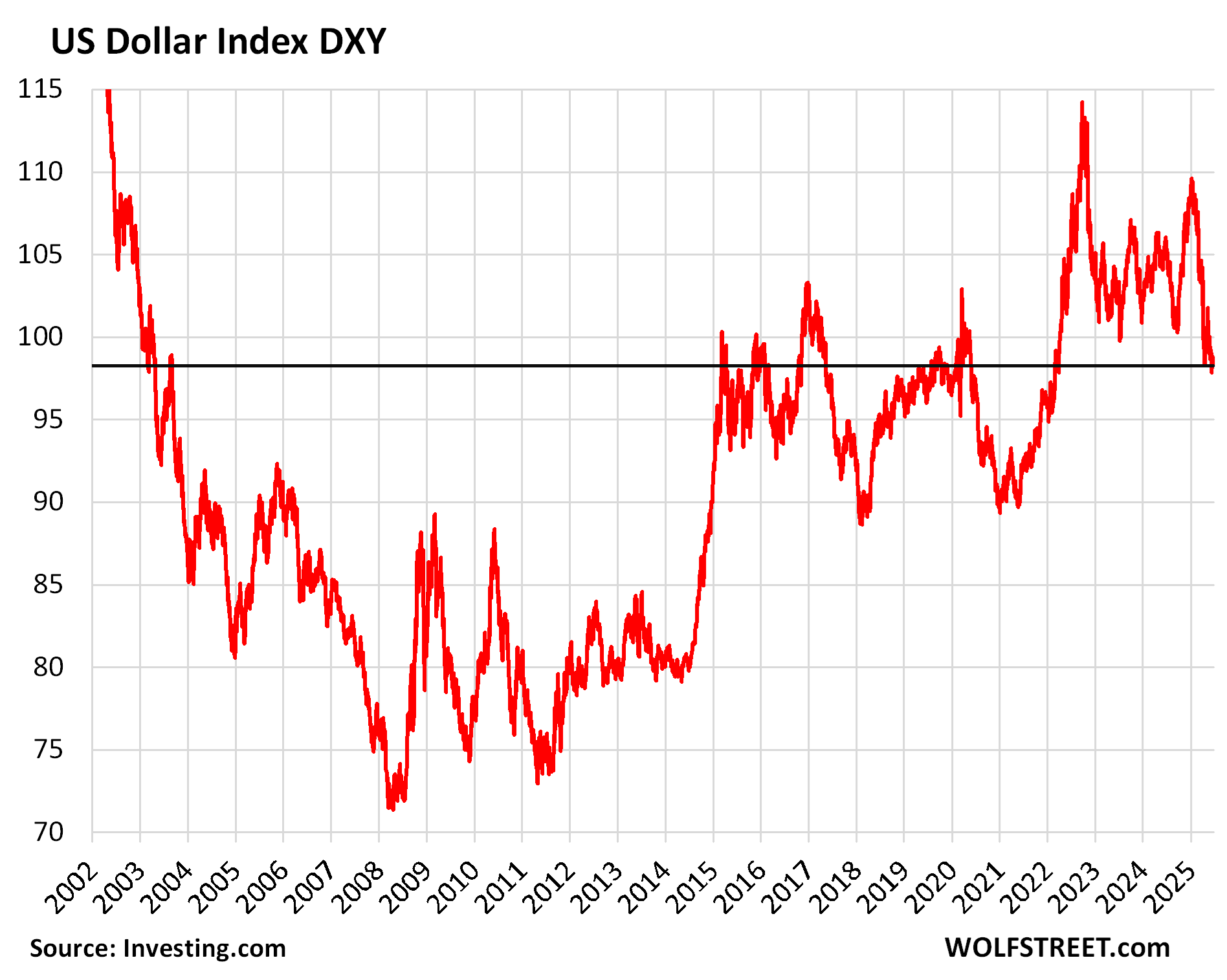 The DXY sits at 98.0 currently, after quite a drop from 110 in January 2025 and from 115 in October 2022. That 98-range is the lowest since April 2022. But it’s in the middle of the range over the past decade and far higher than in 2004 to 2014, when it had wallowed around in the mud sinking even below 75 for some periods during the Financial Crisis.