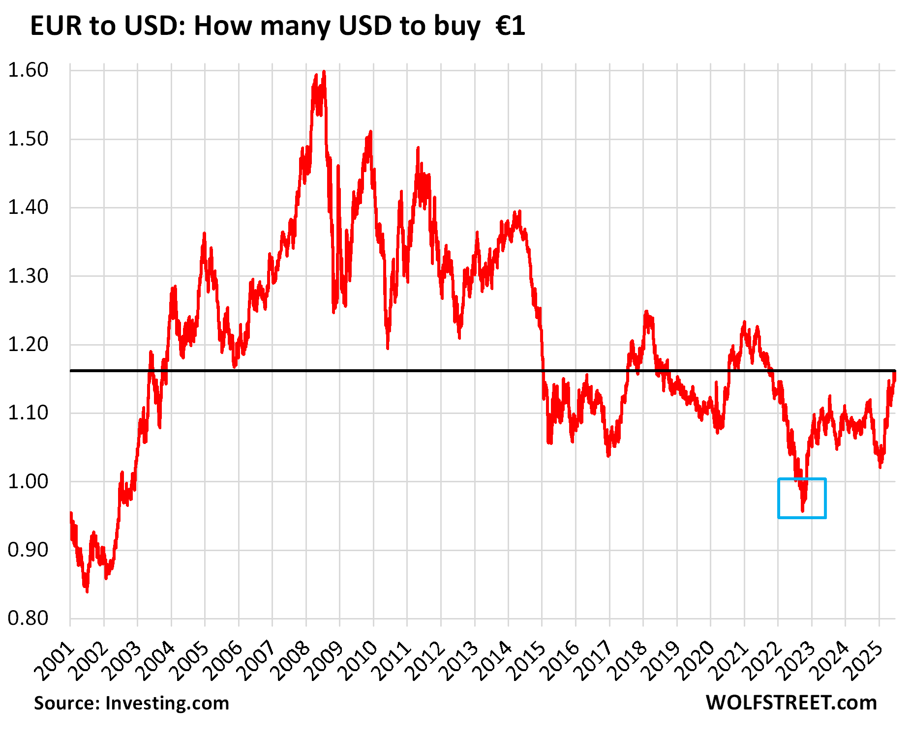 The time for Americans to go to the Euro Area and enjoy good deals was in late 2022, when the euro fell below parity (blue box in the chart below), and the USD bought lots of good deals.