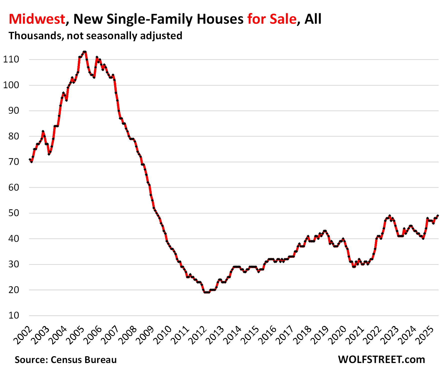 The huge Census region, dominated by Texas and Florida, typically with the most vibrant population growth, is by far the largest market for new houses in the US, accounting for 62% of total US inventory for sale, and for 55% of total US sales in May (a map of the four Census regions is below the article at the top of the comments).
