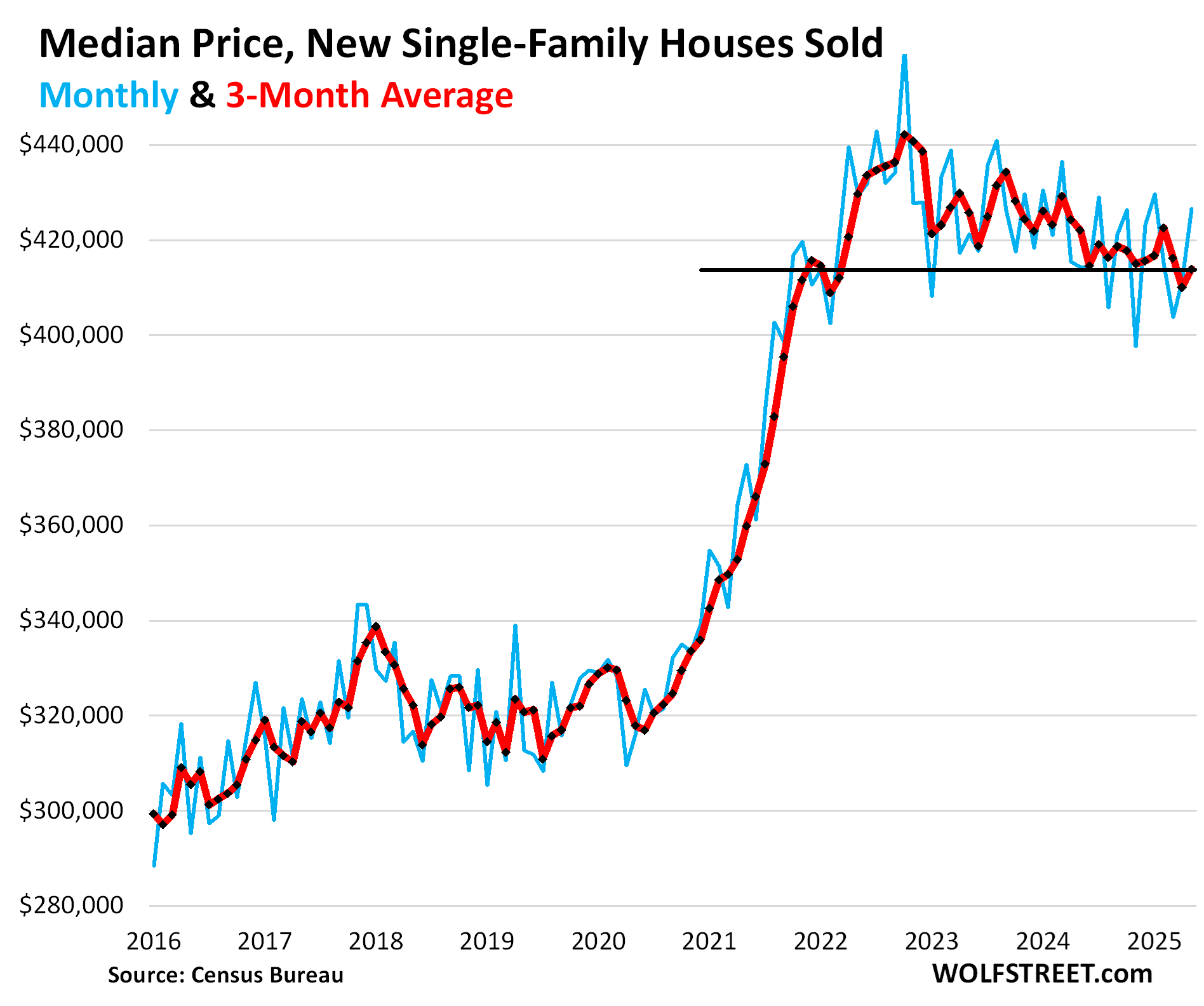 The median contract price, as reported by the Census Bureau, has also zigzagged lower, but only barely, because the rising costs of the mortgage-rate buydowns and other incentives – that have soared to 13.3% of revenues at Lennar – are not included.