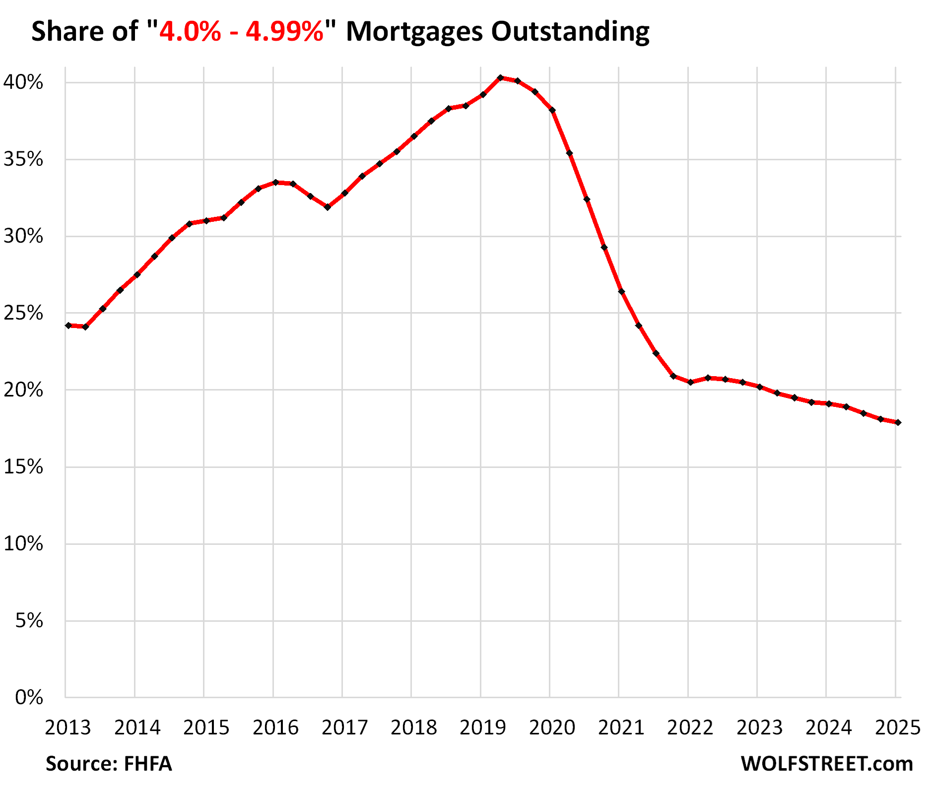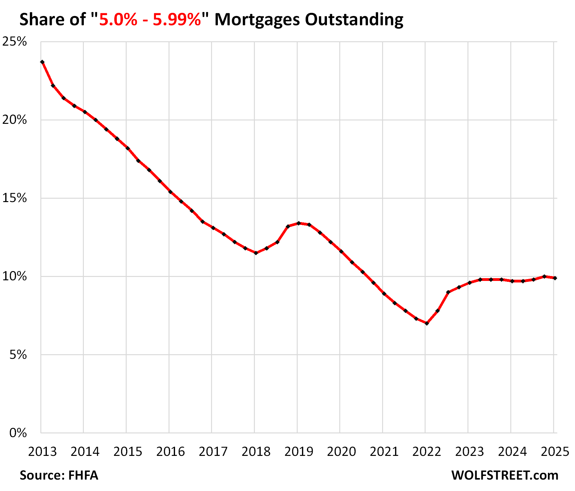 Some of these mortgages were refinanced into lower-rate mortgages when mortgage rates began to drop in 2019. Then in Q2 2020 through Q1 2022, the tsunami of refinancing caused their share to get cut in half, and their share has since then declined further.