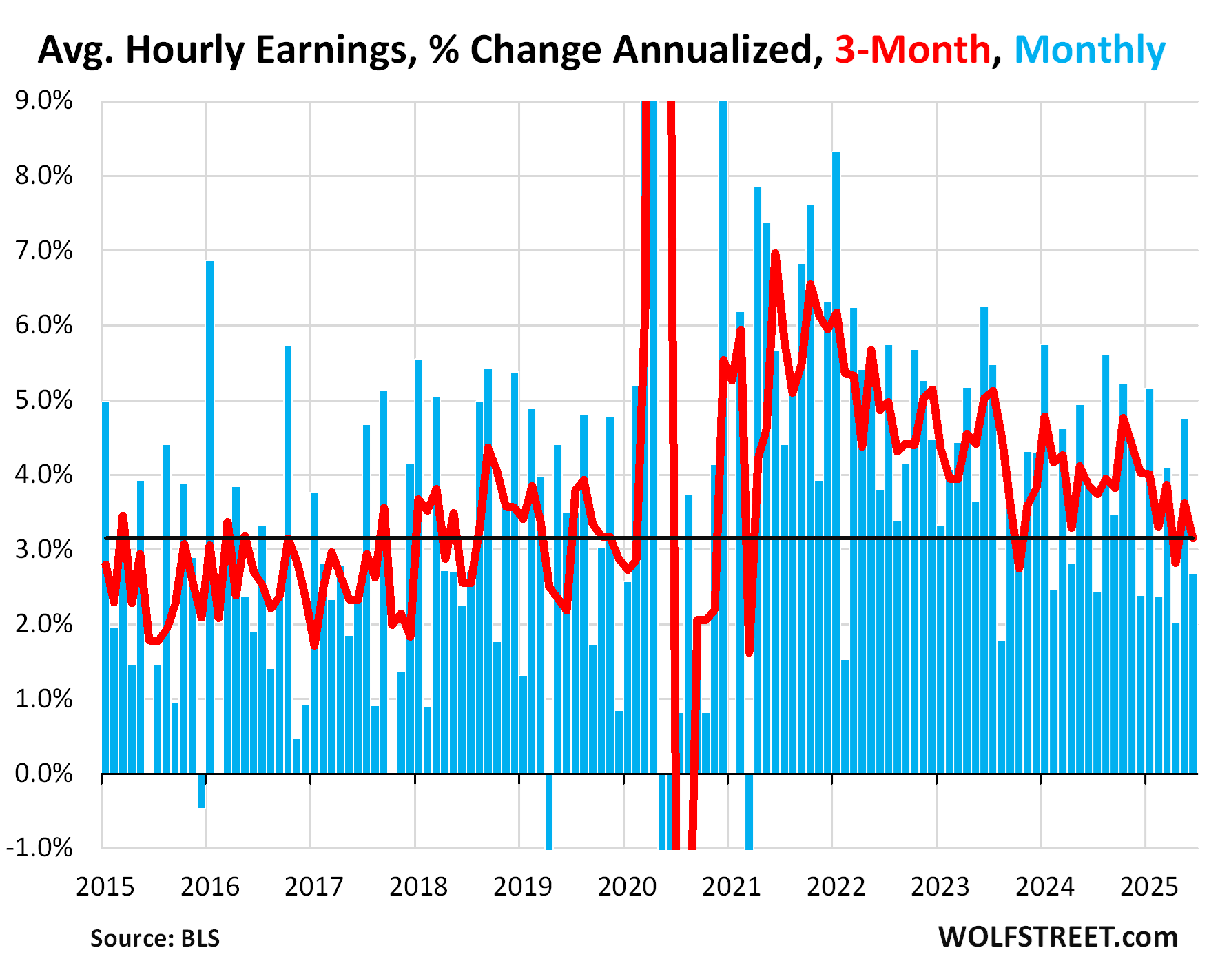 The three-month average, which irons out some of the month-to-month squiggles and includes the revisions, rose by 150,000, the third month in a row of acceleration. The low point was in August 2024 at 84,000 jobs created, upon which the Fed cut its policy rates by 50 basis points in September (red line in the chart).