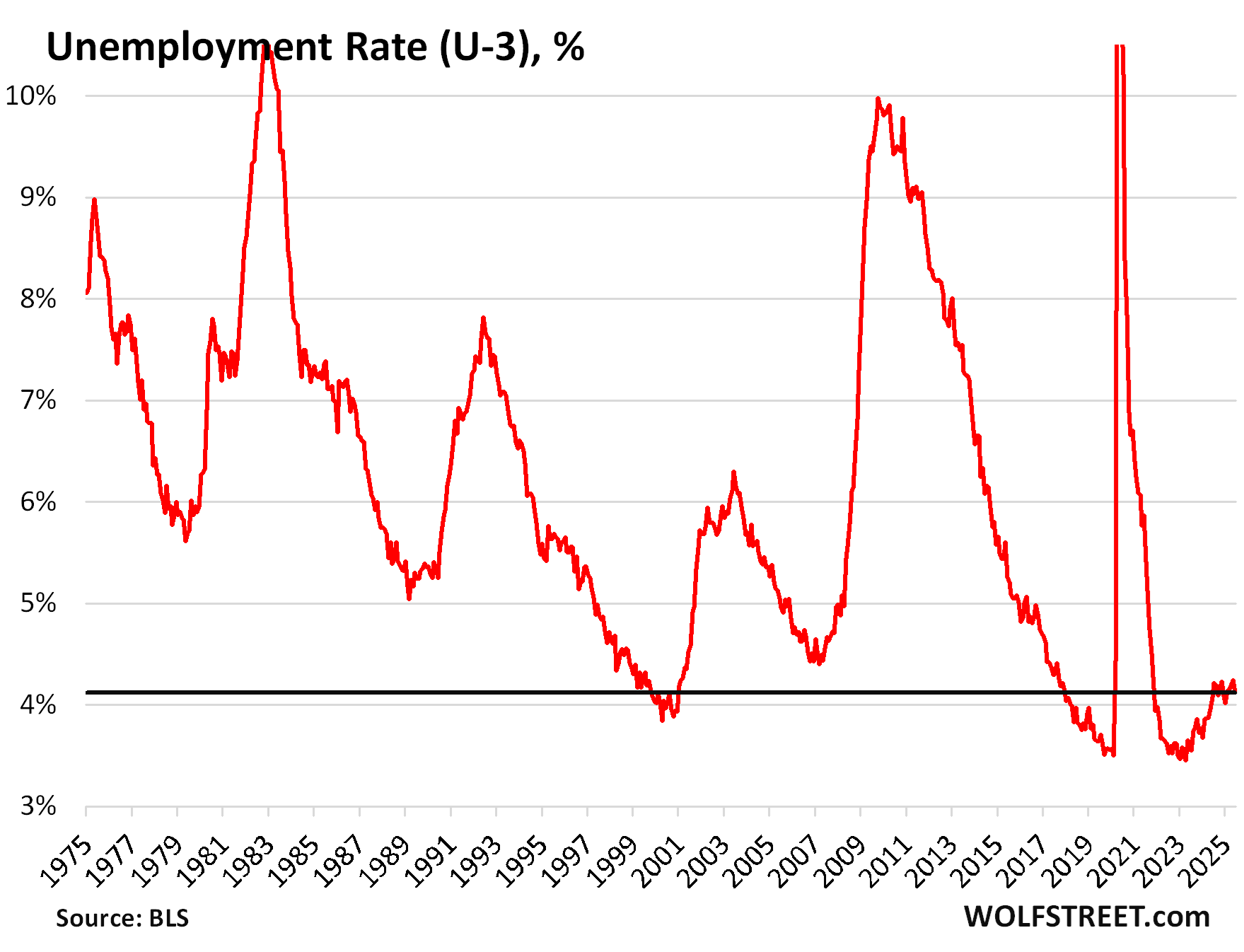 This unemployment rate of 4.1% points at a solid balanced labor market. The Fed’s median projections of the unemployment rate have been ratcheting higher, at the June meeting to 4.5% for the end of 2025. The actual unemployment rates over the past 12 months of 4.0% to 4.2% have been undershooting the Fed’s projections.