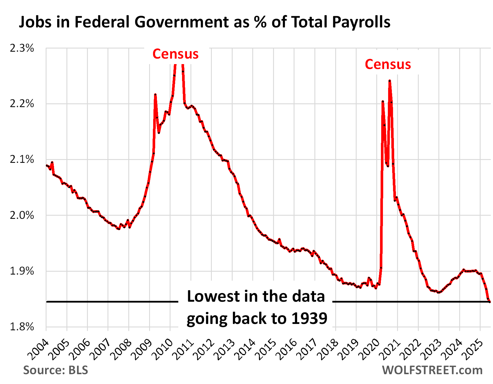 The share of federal government jobs dropped to 1.84% of total nonfarm payrolls, the lowest share in the data going back to 1939. It peaked during the Second World War at over 7%. During the 1980s, it was around 3.0%: