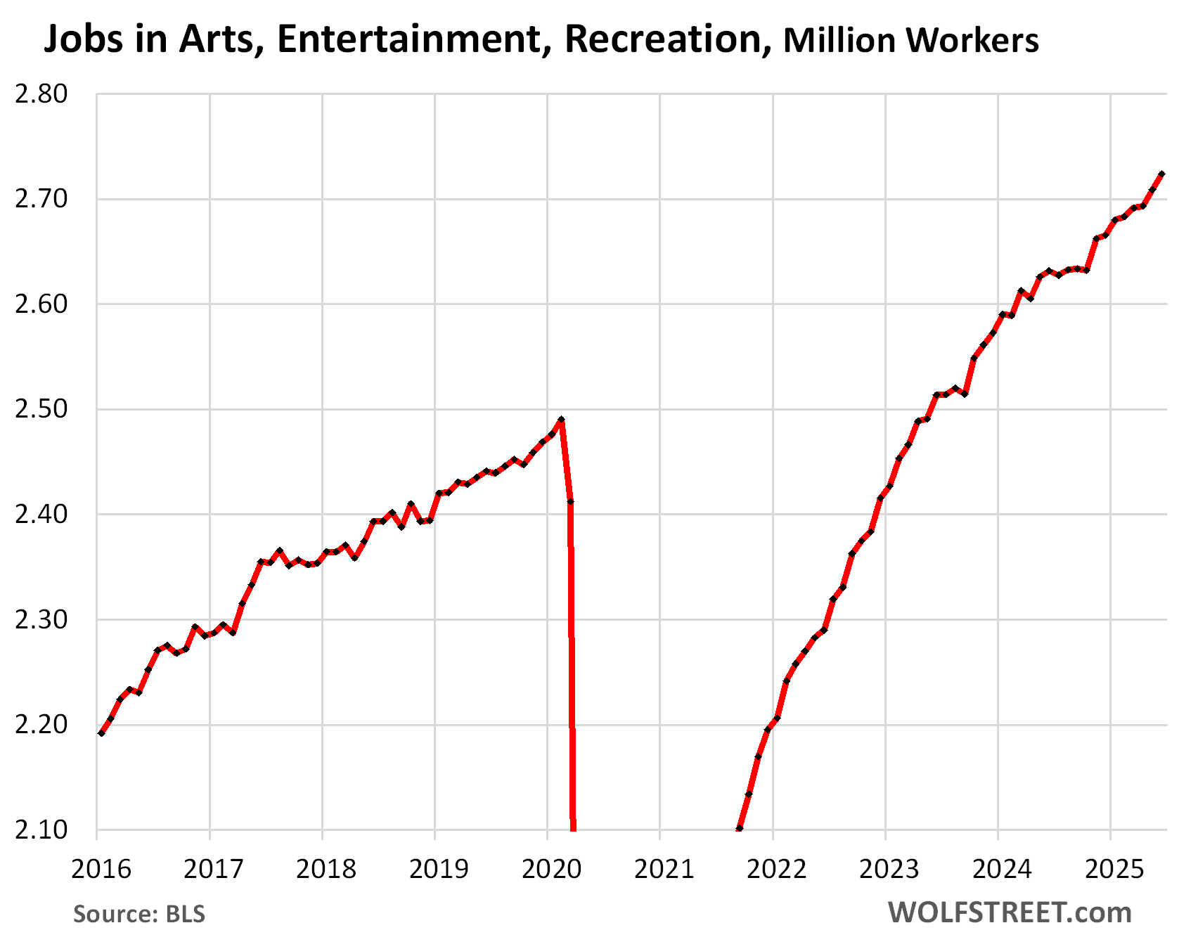 Leisure and hospitality – restaurants, lodging, resorts, etc. After getting essentially shut down during the lockdowns, the industry’s employment has fully recovered but is only marginally higher than it was five years ago: