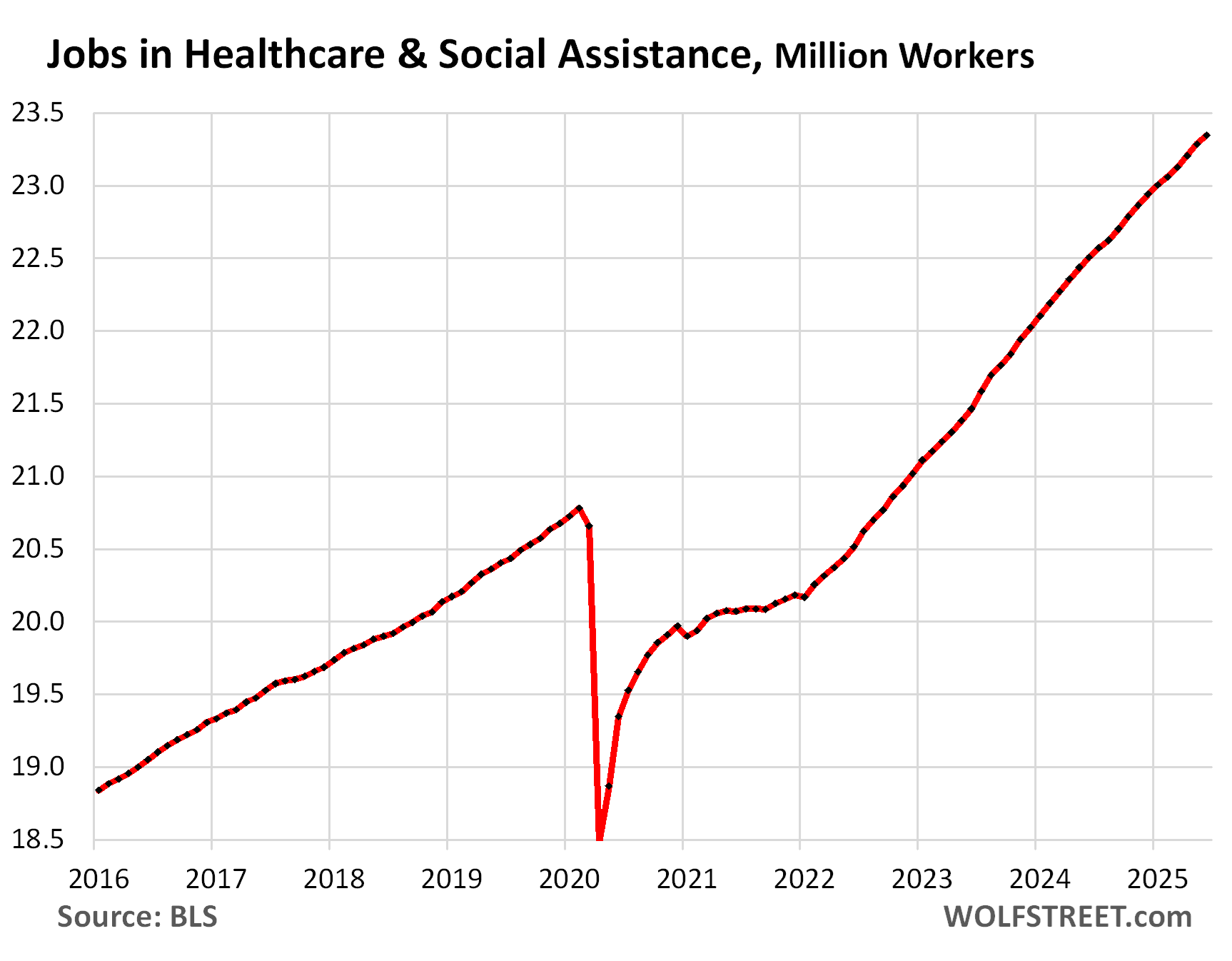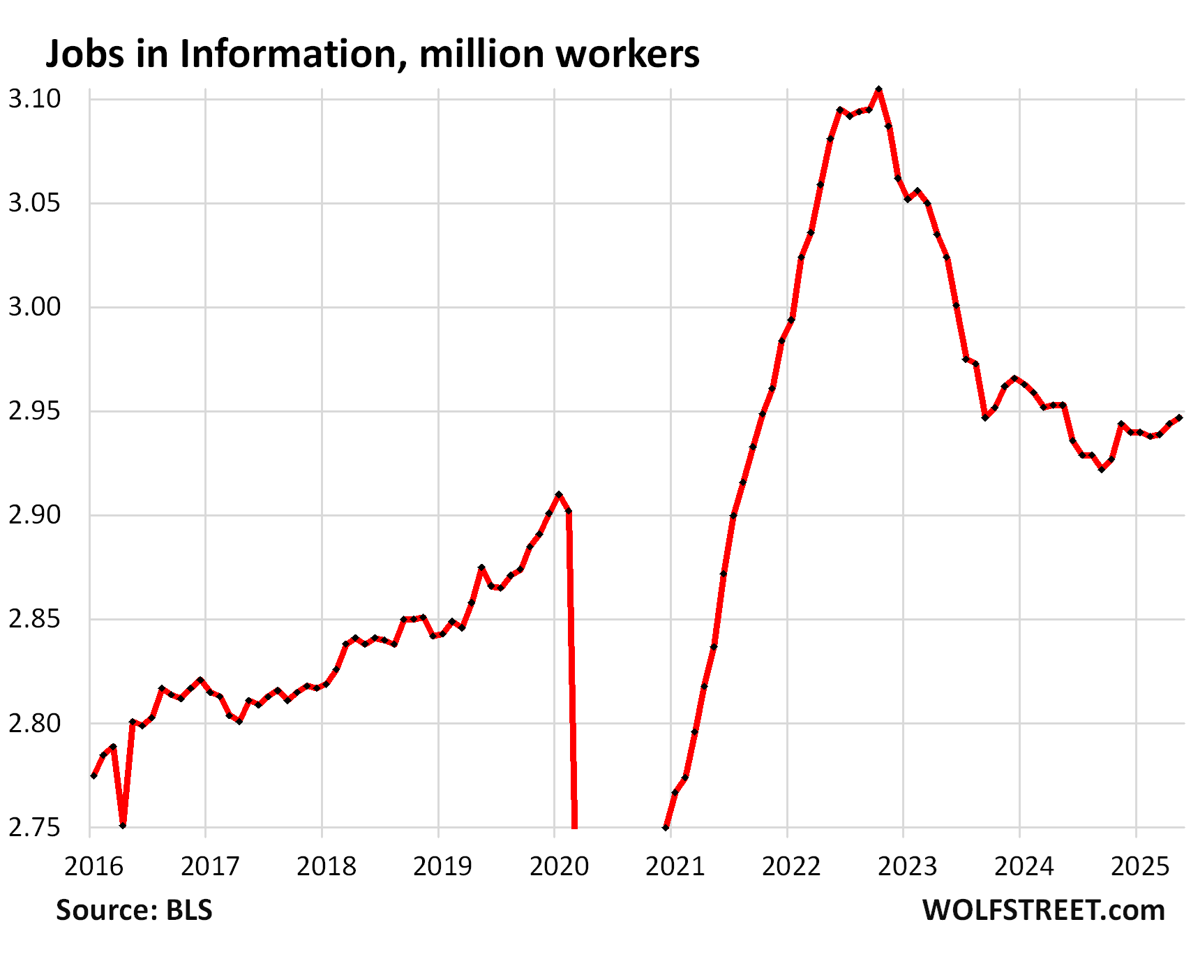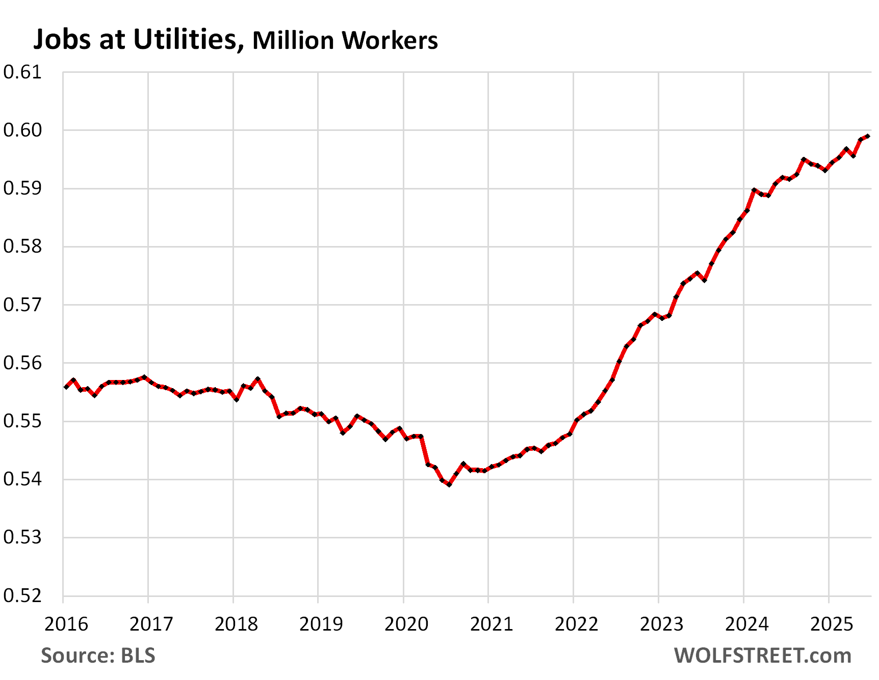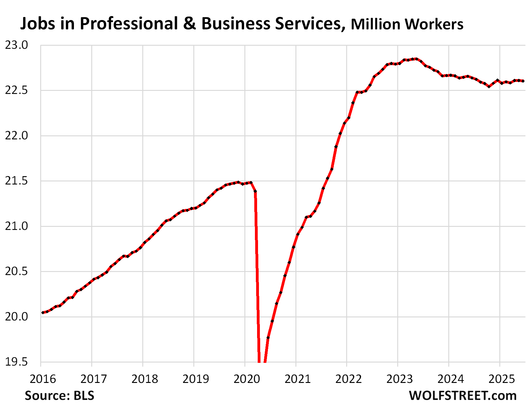 The explosion of employment in 2021 and 2022 turned out to be a bout of massive over-hiring. Companies then came to their senses and began shedding the excess they’d added over those years. Those efforts apparently bottomed out in October 2024, and since then employment has wobbled higher.