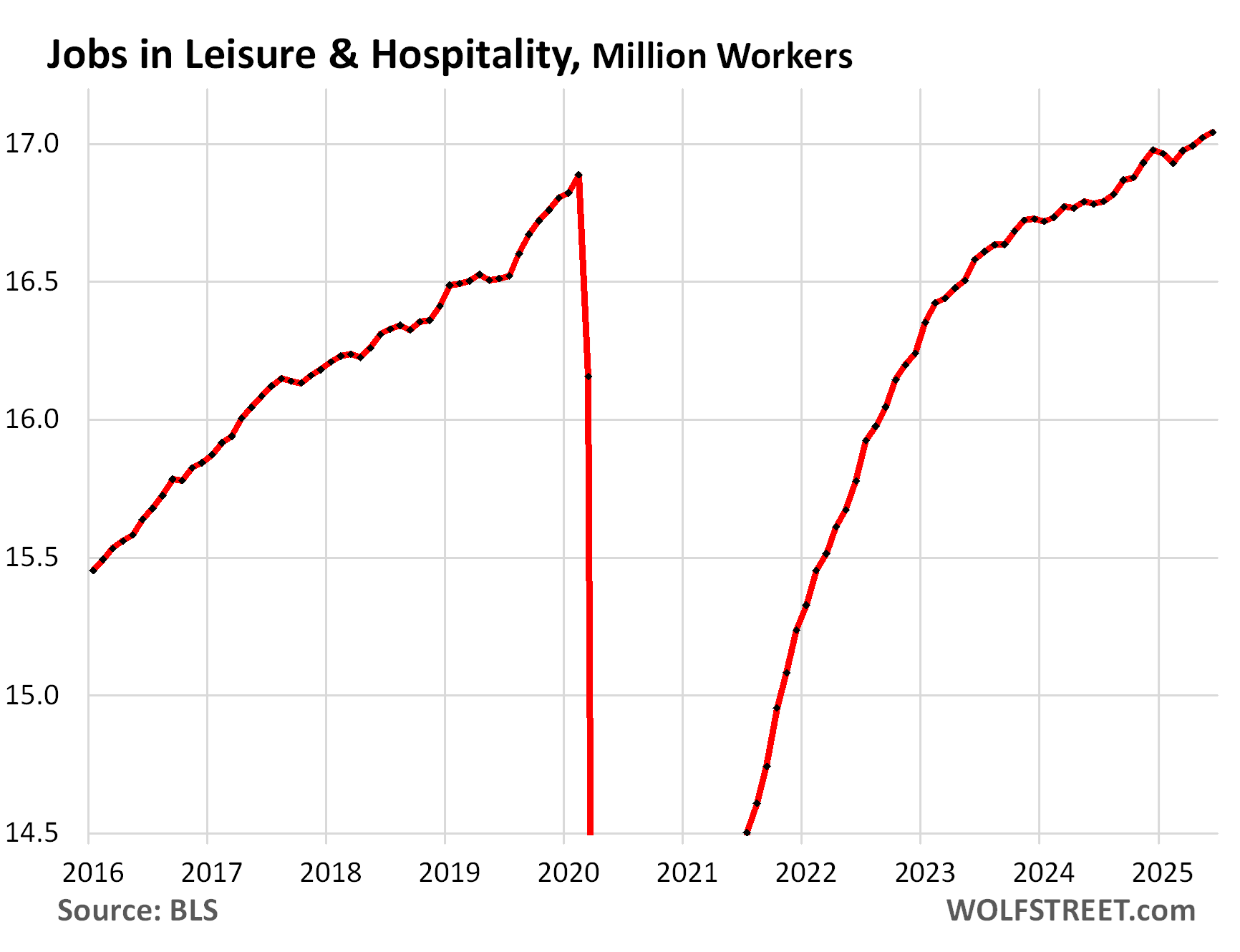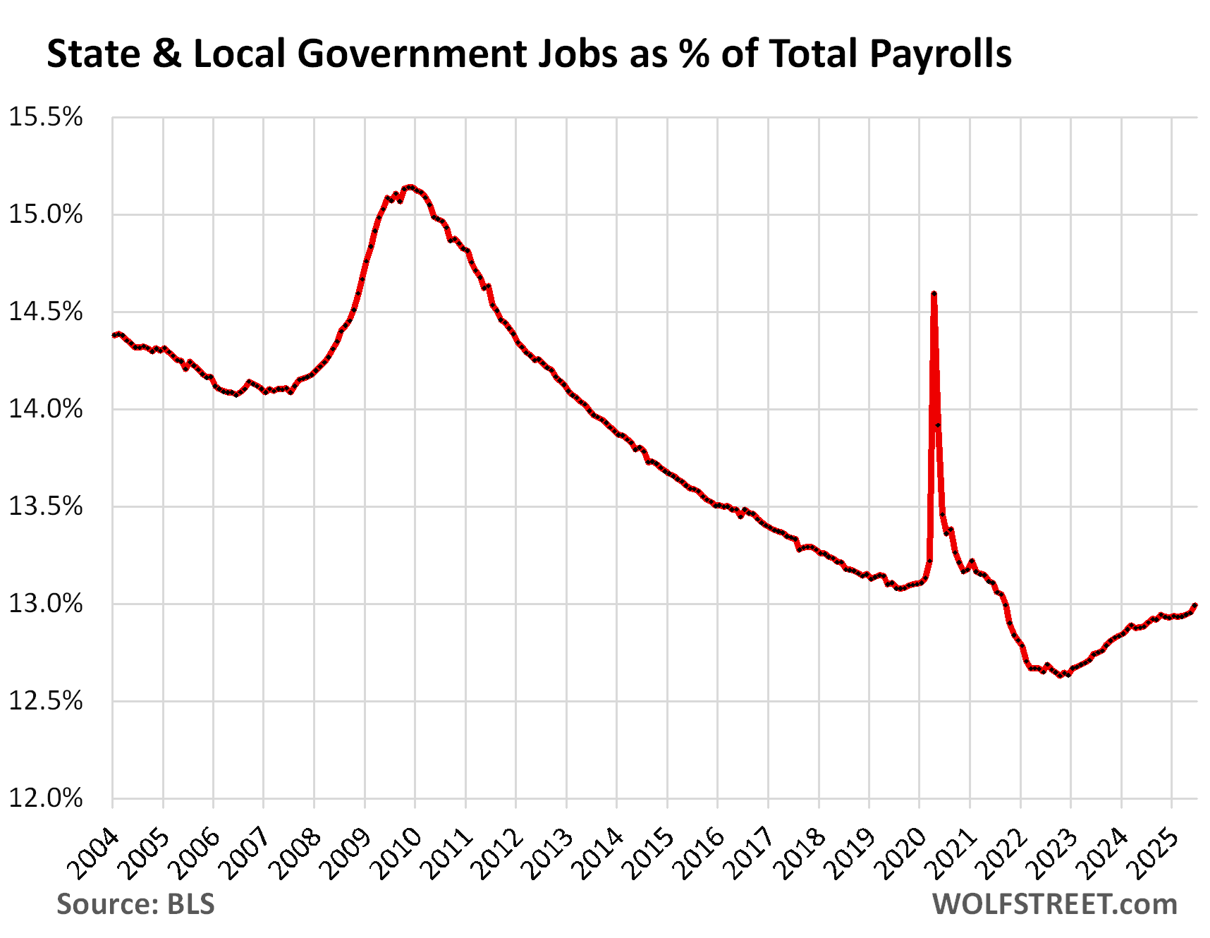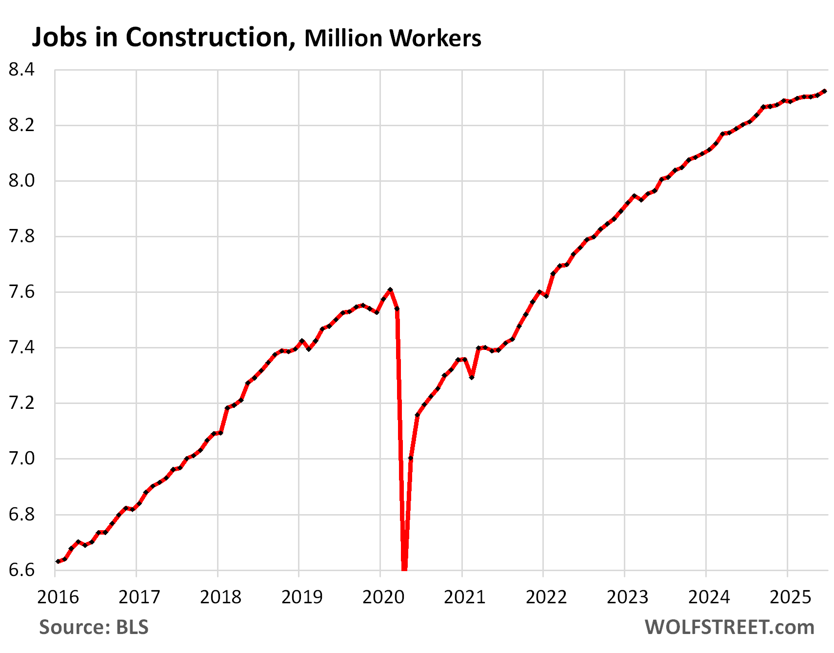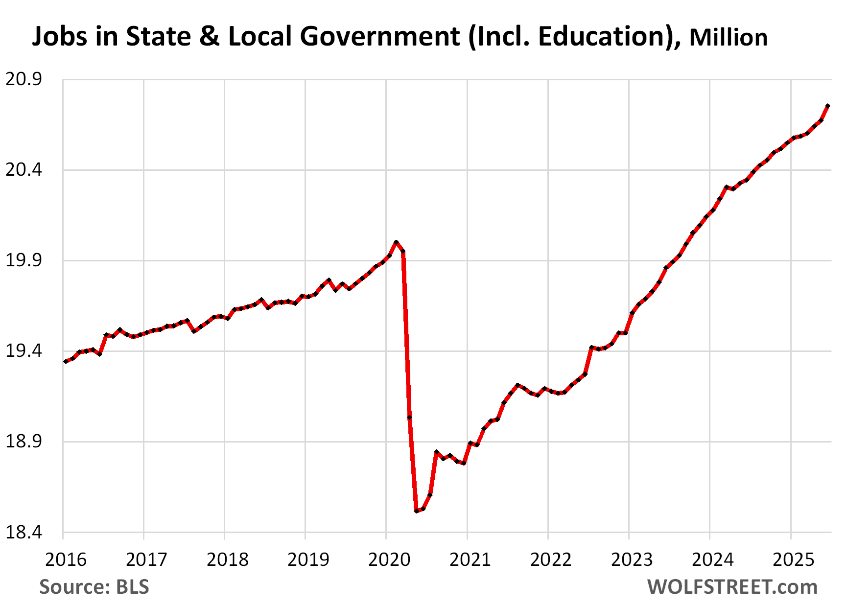 The explosion of employment in 2021 and 2022 turned out to be a bout of massive over-hiring. Companies then came to their senses and began shedding the excess they’d added over those years. Those efforts apparently bottomed out in October 2024, and since then employment has wobbled higher.