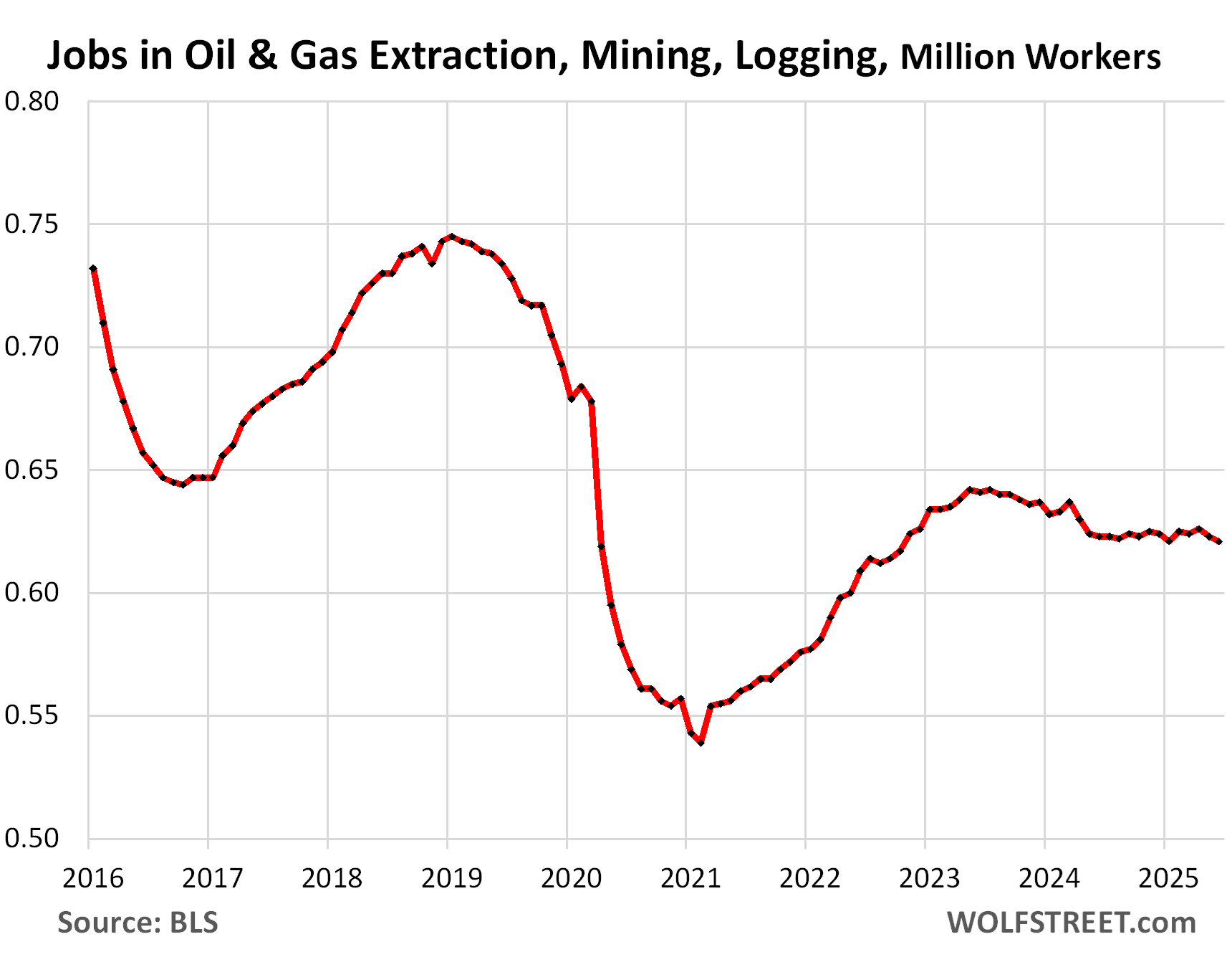 The jobs included here are in the oil and gas field, such as on drilling rigs. The oil and gas industry’s tech workers, engineers, traders, finance people, managers, lawyers, etc. are counted in other categories, including Professional and business, and scientific services.