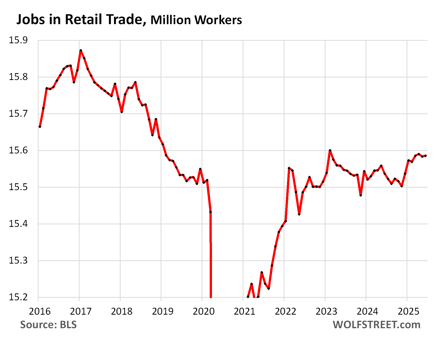 Retail trade counts workers at brick-and-mortar retail stores, such as malls, auto dealers, grocery stores, gas stations, etc., and other retail locations such as markets. It does not include the tech-related jobs of ecommerce operations, drivers, and warehouse employees.