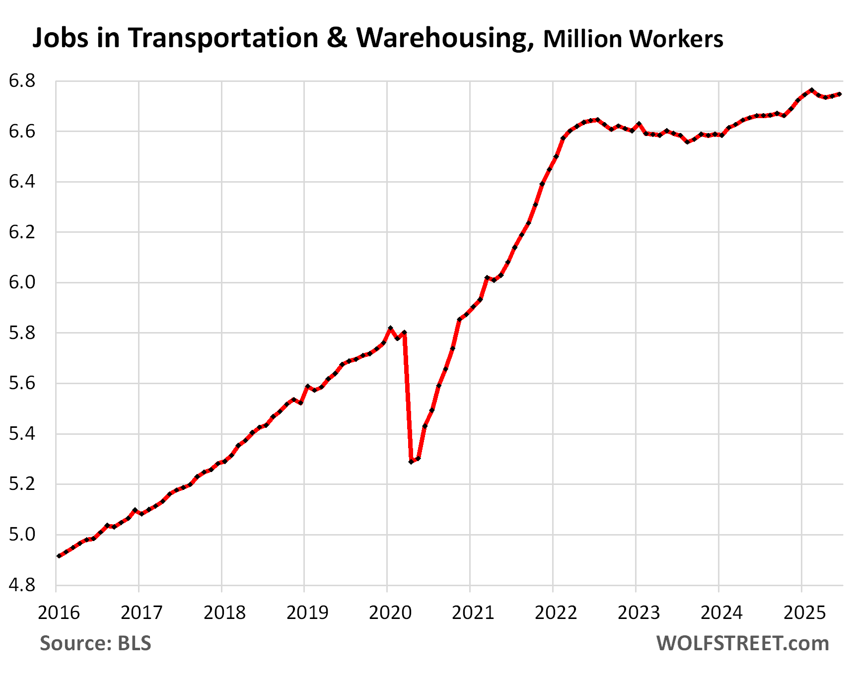 The jobs in each industry are defined by work location. The surveys are sent to employer facilities. The primary activity at that facility determines the industry category. For example, a worker at an Amazon fulfillment center would be under “transportation and warehousing,” not “retail.” It’s not the company that matters, but the work being done at that specific location.
