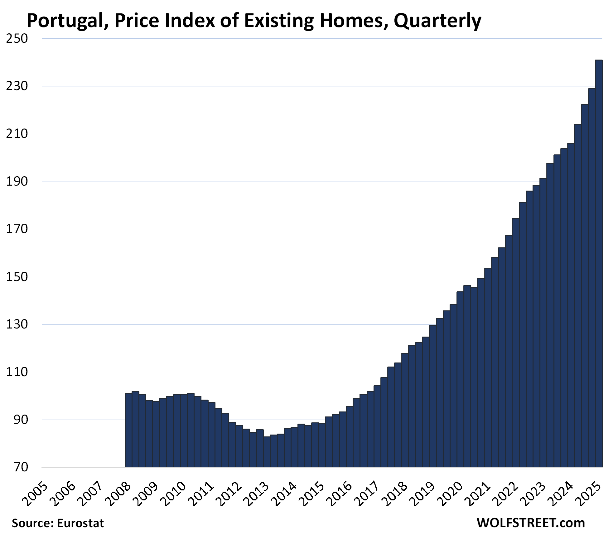 Portugal real estate bubble is crazy. The prices in Lissabon are inflated even more than the article suggests. The prices in the country side are quite low but the appriciation in the costal cities, especially Lissabon is insane.