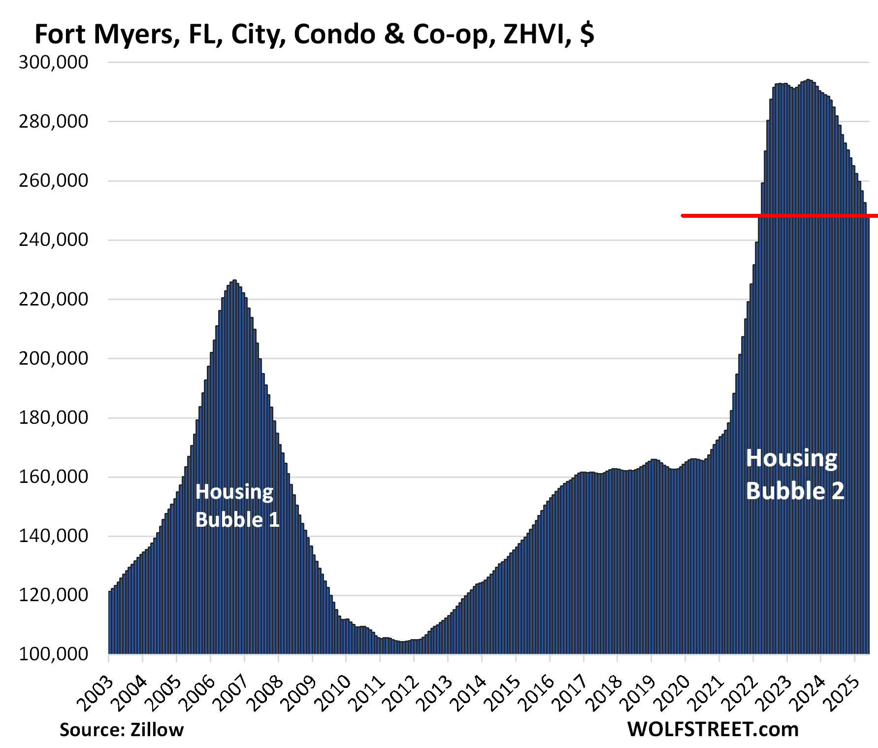 In Fort Myers, condo prices have plunged by 16% since July 2022 after one of the craziest and silliest home-price explosions ever. There is a reality somewhere, and the market is trying to find it: