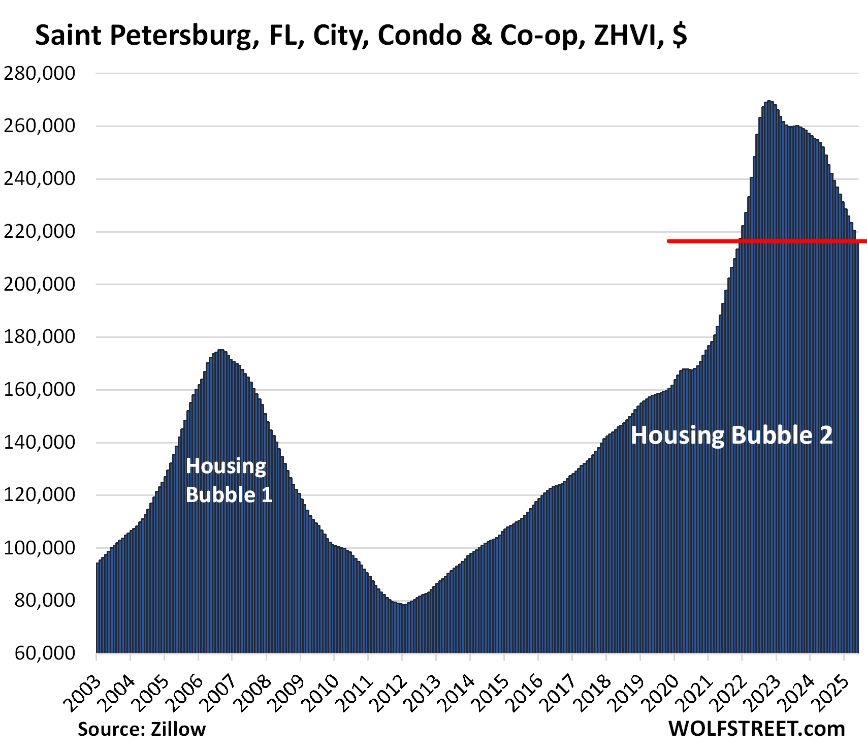 Home-sellers that sold in 2024 and in 2023 at near peak prices got out the door with their money. He who panics first panics best. Since then, prices have drifted lower, and condo prices in many markets are now plunging – see price charts at the bottom for Fort Myers and Saint Petersburg.