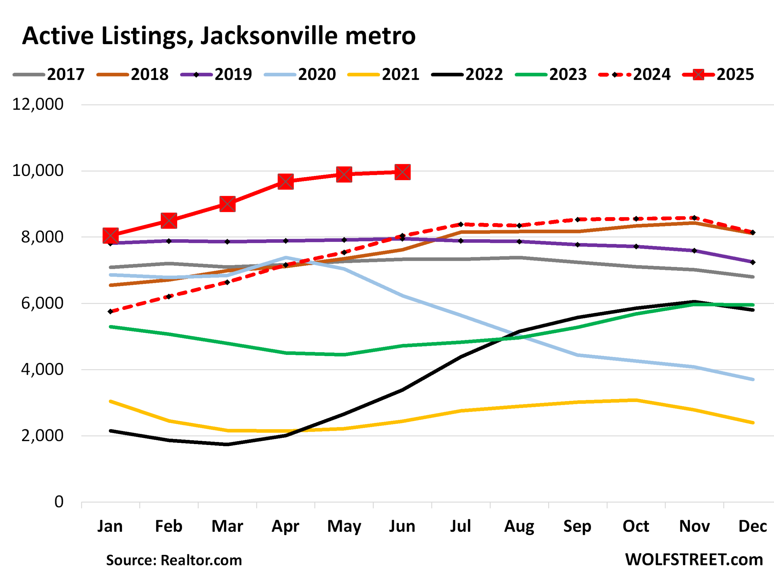 In the Jacksonville metro, active listings jumped by 24% year-over-year, to 9,965 homes, the highest in the data from realtor.com.