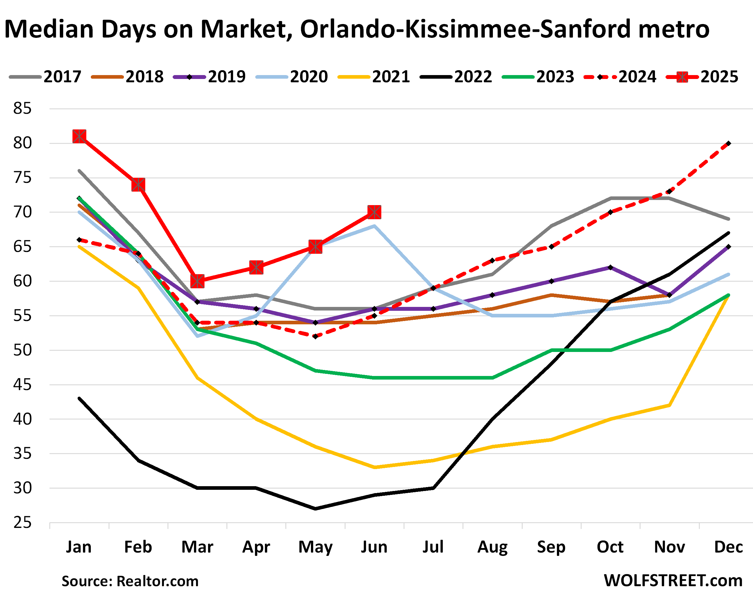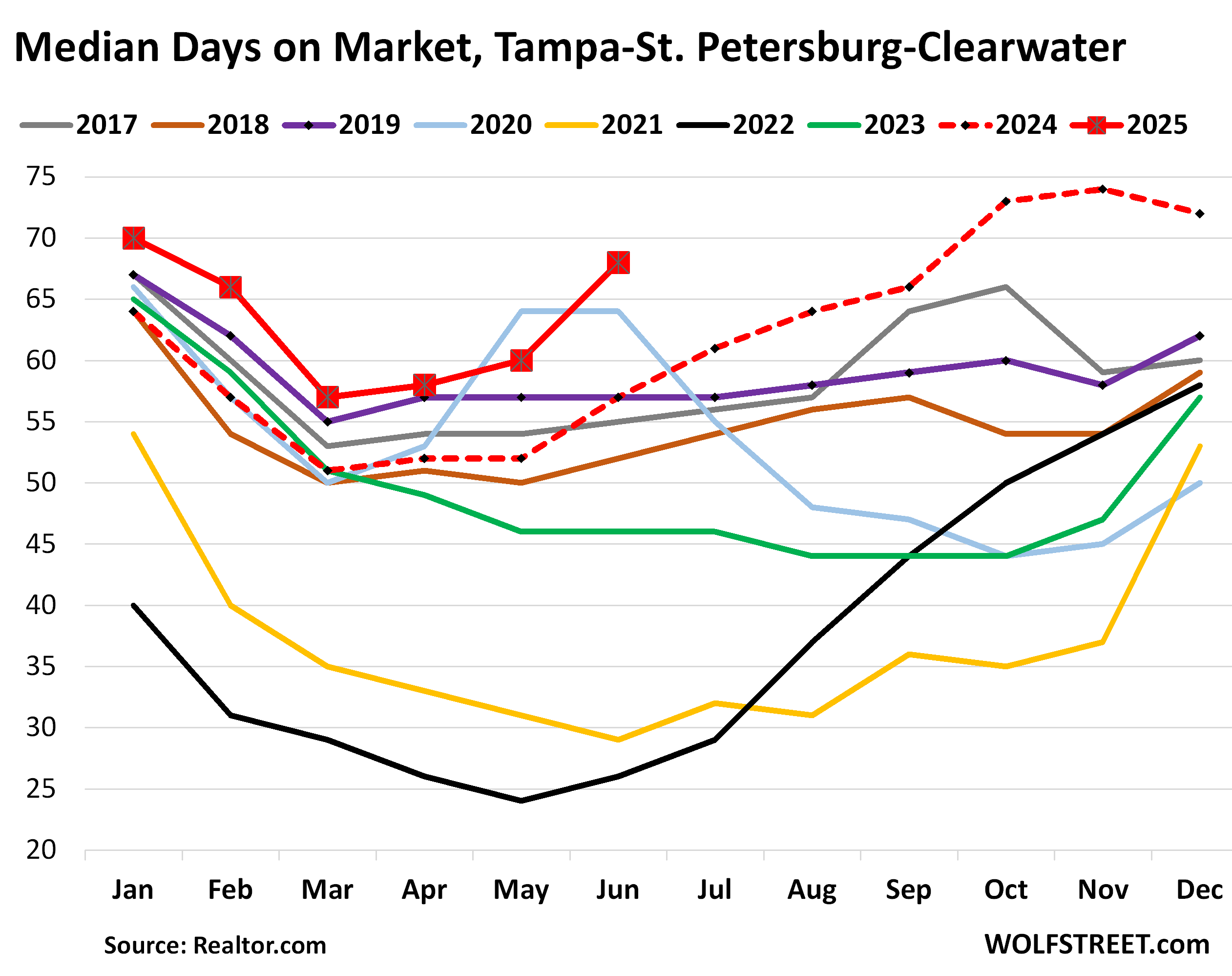 Homes sat on the market for 70 days before they got pulled off the market or were sold, the highest for any in June in the data from realtor.com, which goes back to 2016, up from 55 days in June 2024 and up from the 54-56 range for the Junes in 2017-2019: