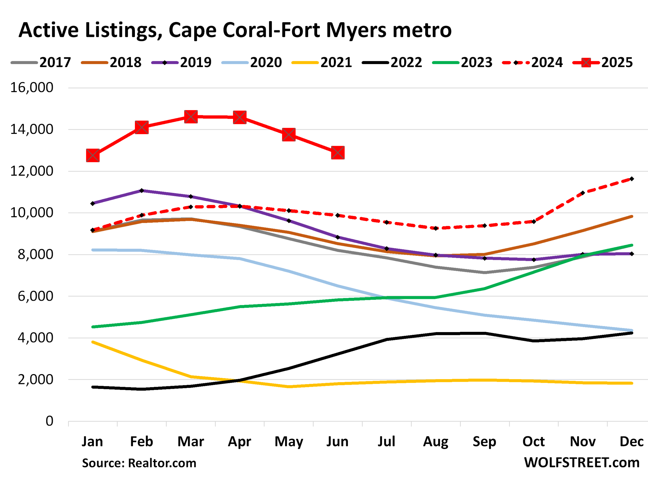 In the Cape Coral-Fort Myers metro, active listings jumped by 30% year-over-year, to 12,892 homes, the highest June in the data from realtor.com.