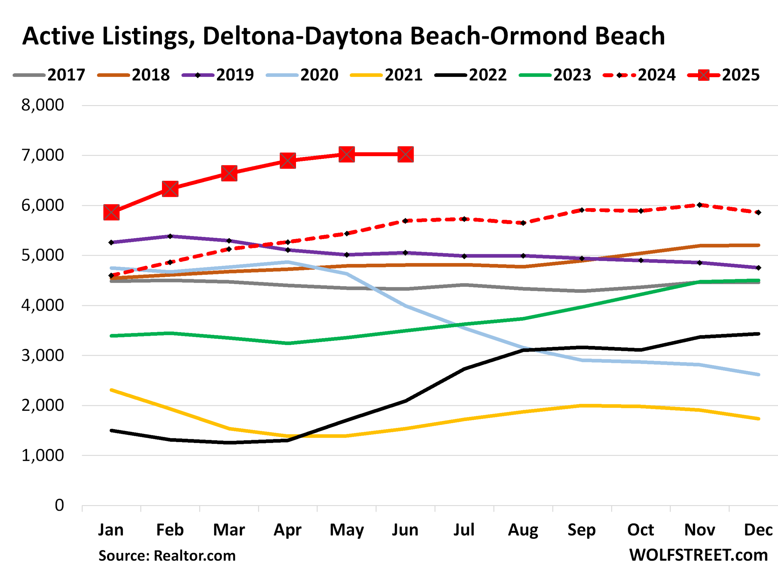 In the Deltona-Daytona Beach-Ormond Beach metro, active listings rose by 23% year-over-year to 7,021 homes, the highest in the dataset from realtor.com.