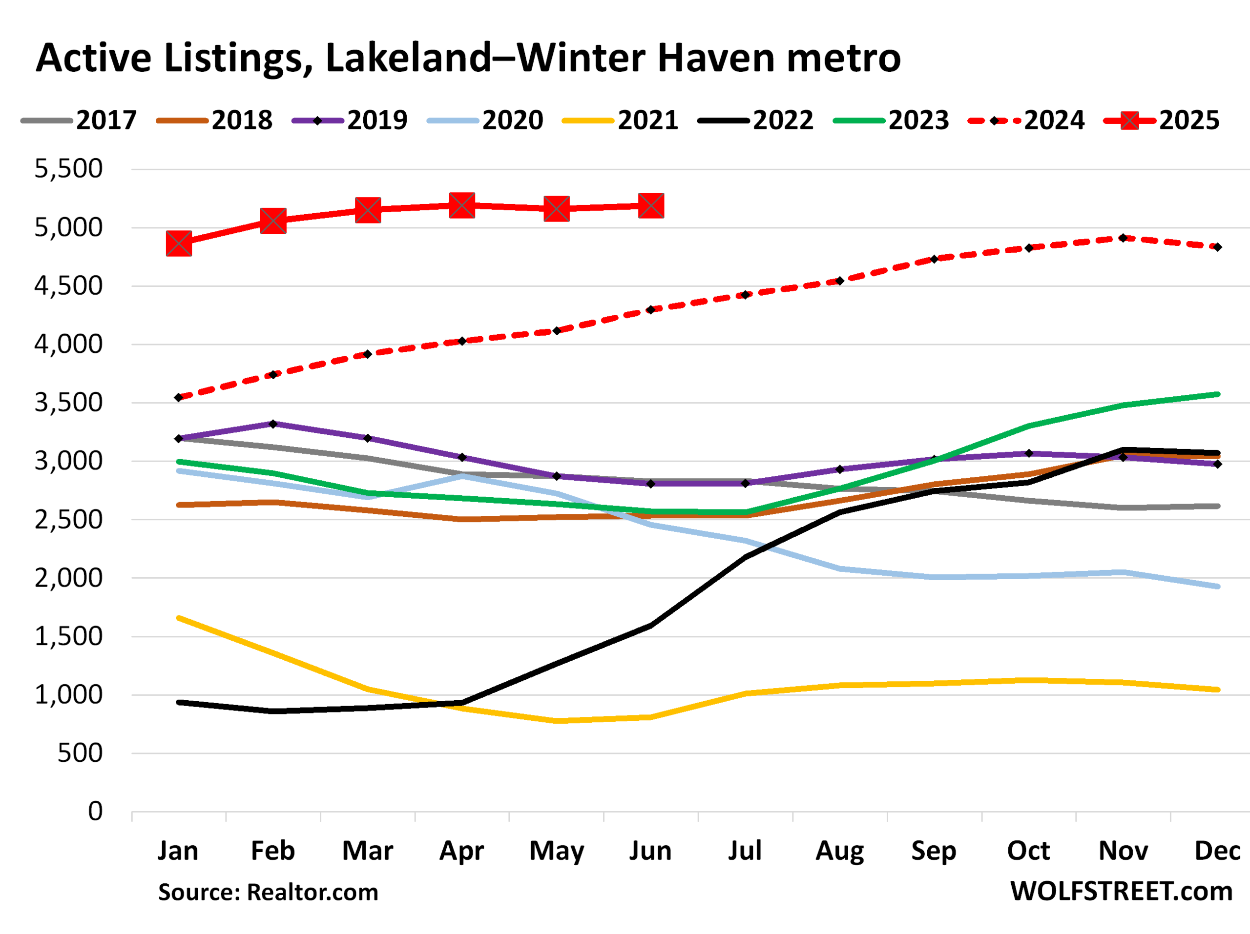 In the Lakeland-Winter Haven metro, active listings rose by 21% from the already extreme levels last June, to 5,189 listings, the most in this dataset that goes back to 2016.