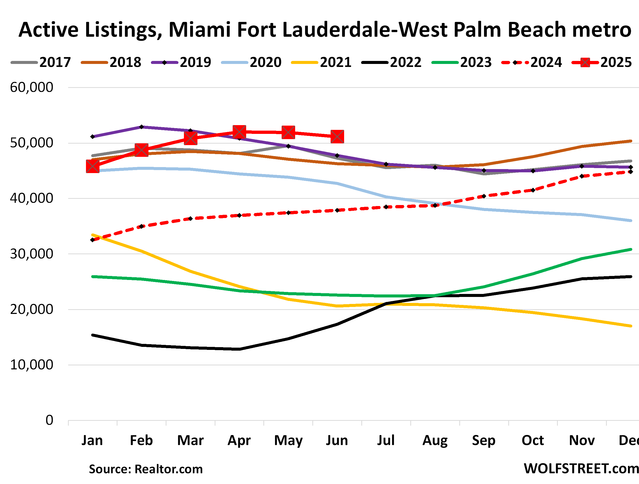In the Miami-Fort Lauderdale-West Palm Beach metro, active listings jumped by 35% year-over-year in May, to 51,139 homes, the highest June in the dataset from realtor.com, which goes back to 2016.