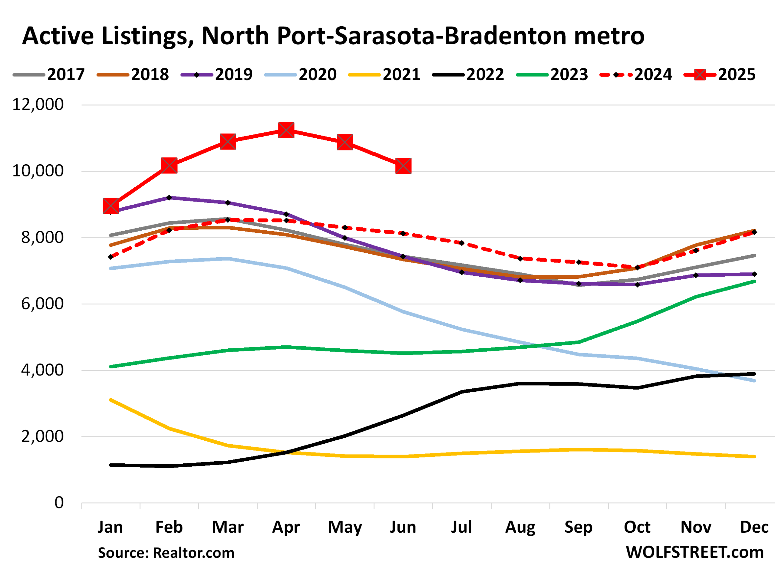 In the North Port-Sarasota-Bradenton metro, active listings rose by 25% from June last year, which had already been the highest June in the data from realtor.com going back to 2016; to an even higher 10,163 homes.