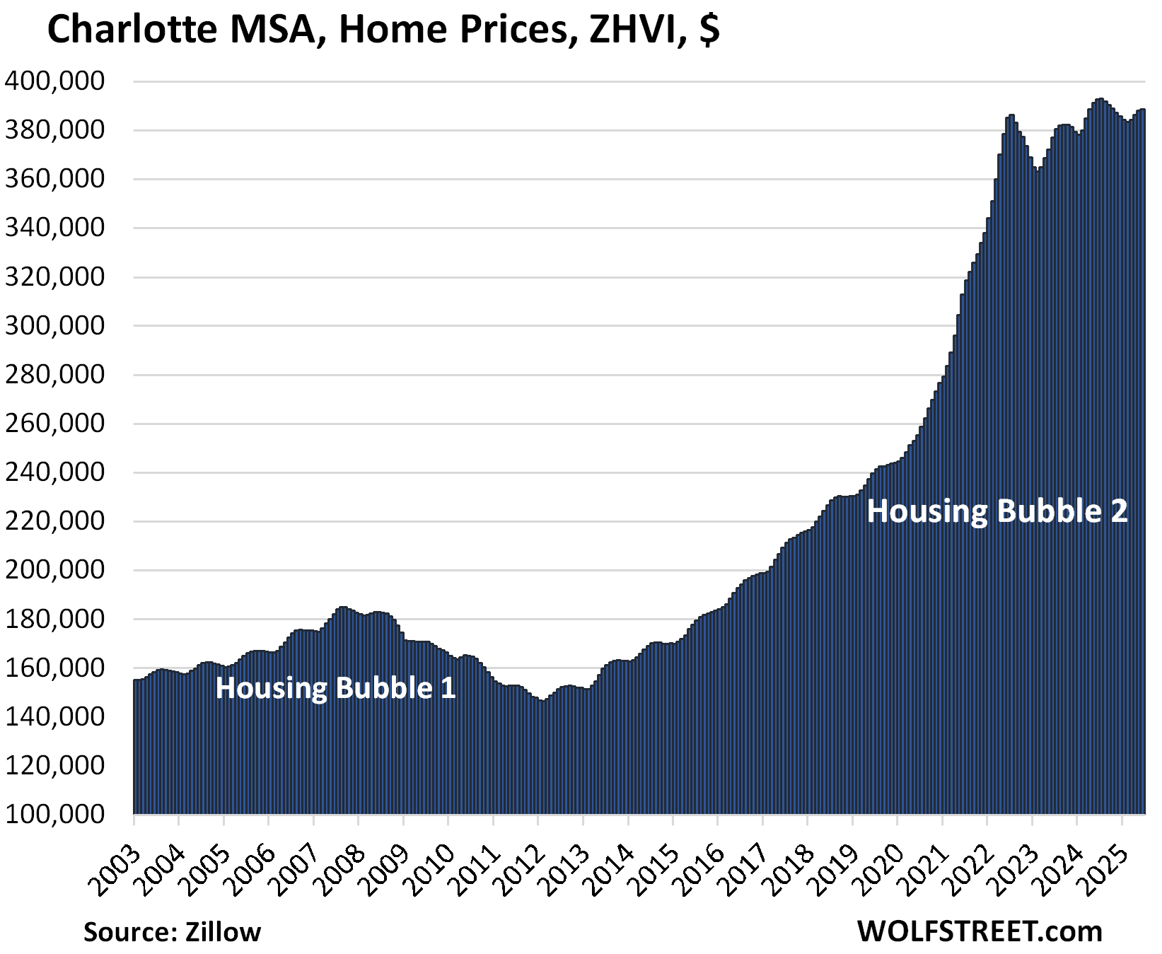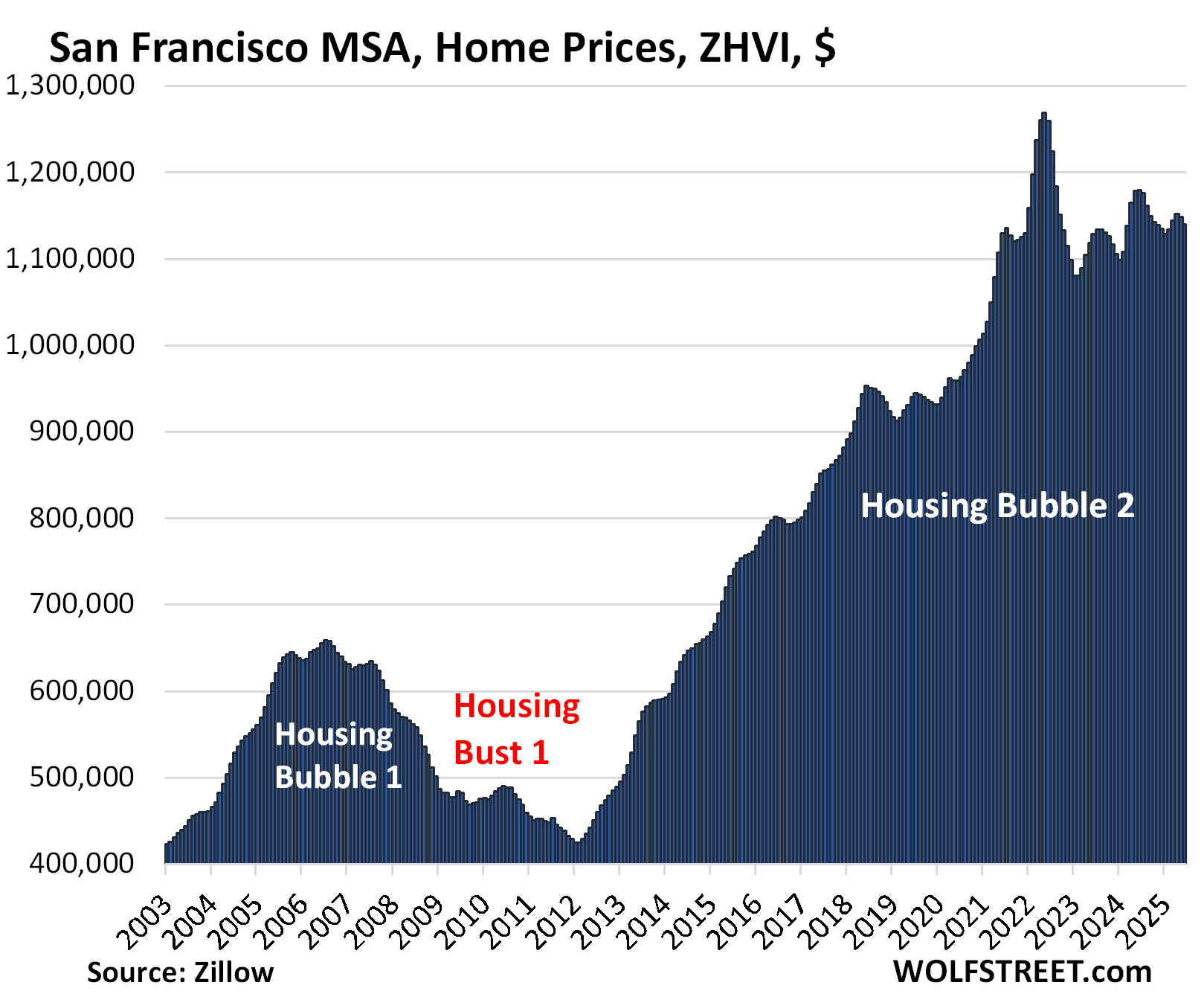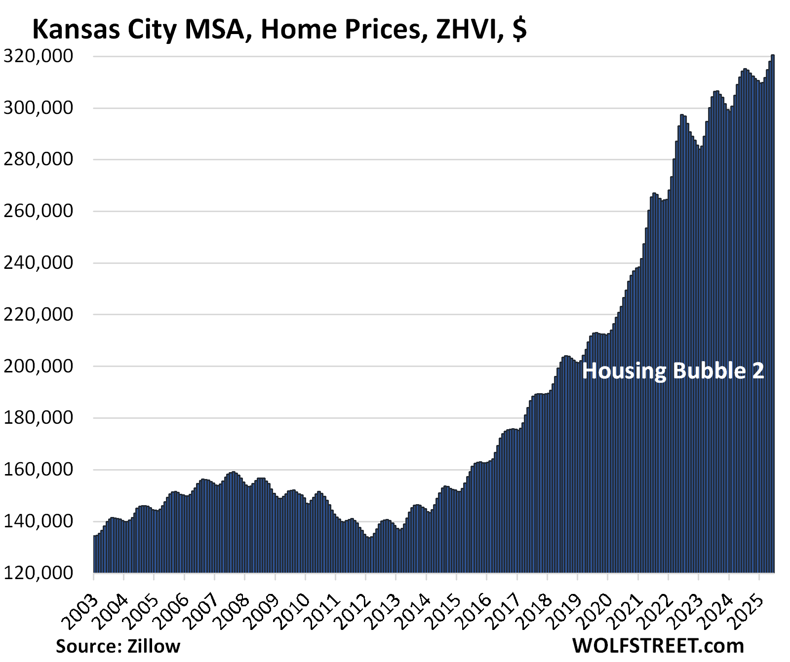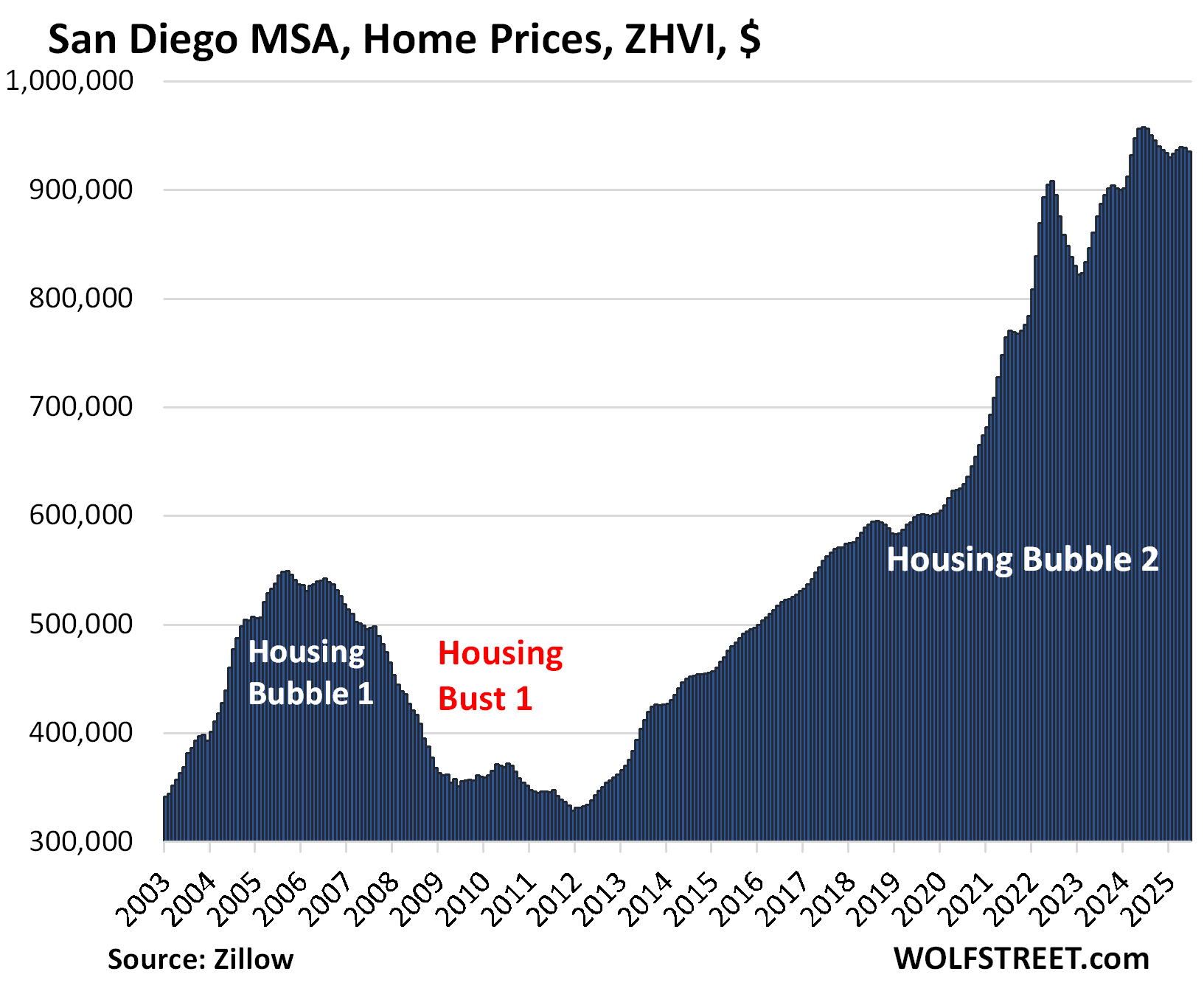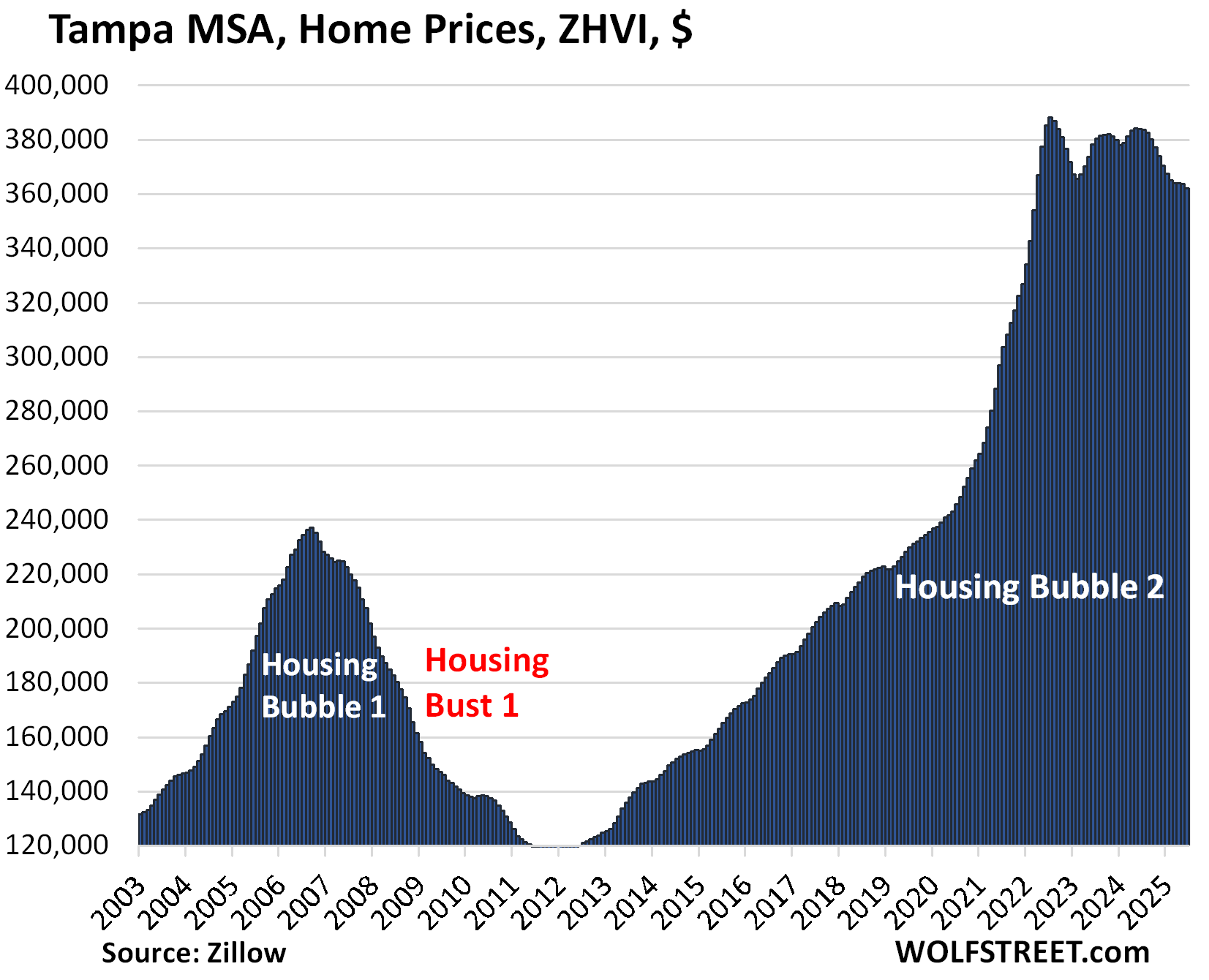 To qualify for this list, the MSA must be one of the largest by population and must have had a ZHVI of at least $300,000 at some point. Some metros that are large enough don’t qualify for this list because their ZHVI has never reached $300,000, despite the blistering surge of home prices in recent years, such as the metros of New Orleans, Memphis, Oklahoma City, Tulsa, Cincinnati, and Pittsburgh.