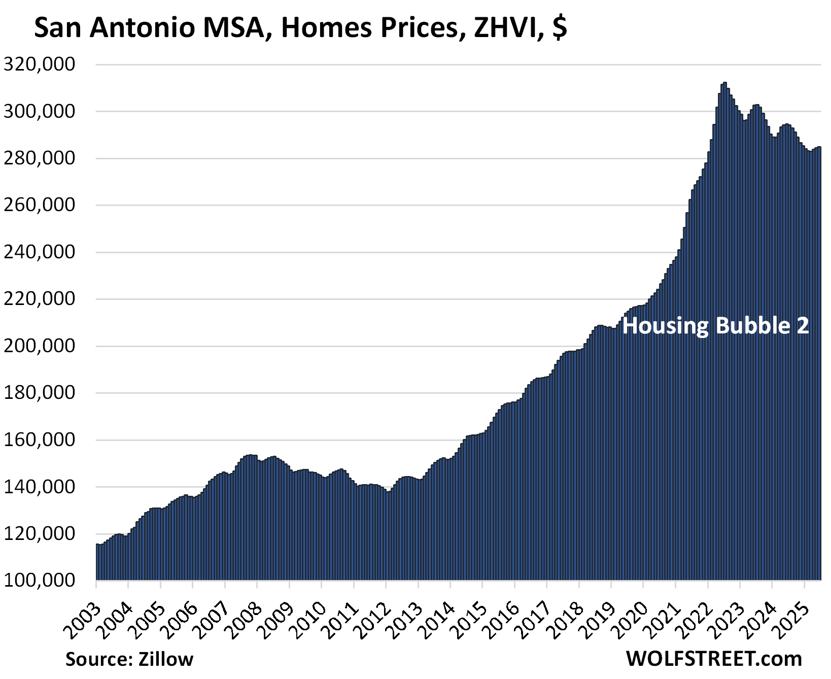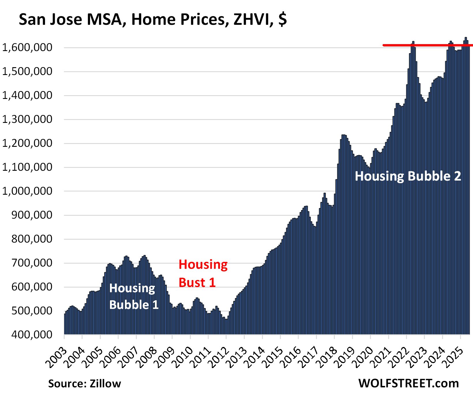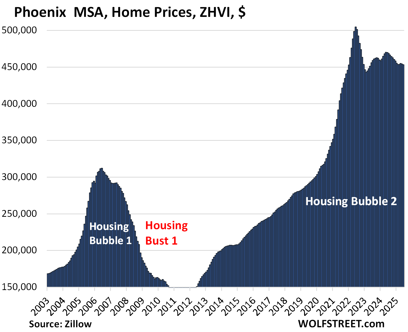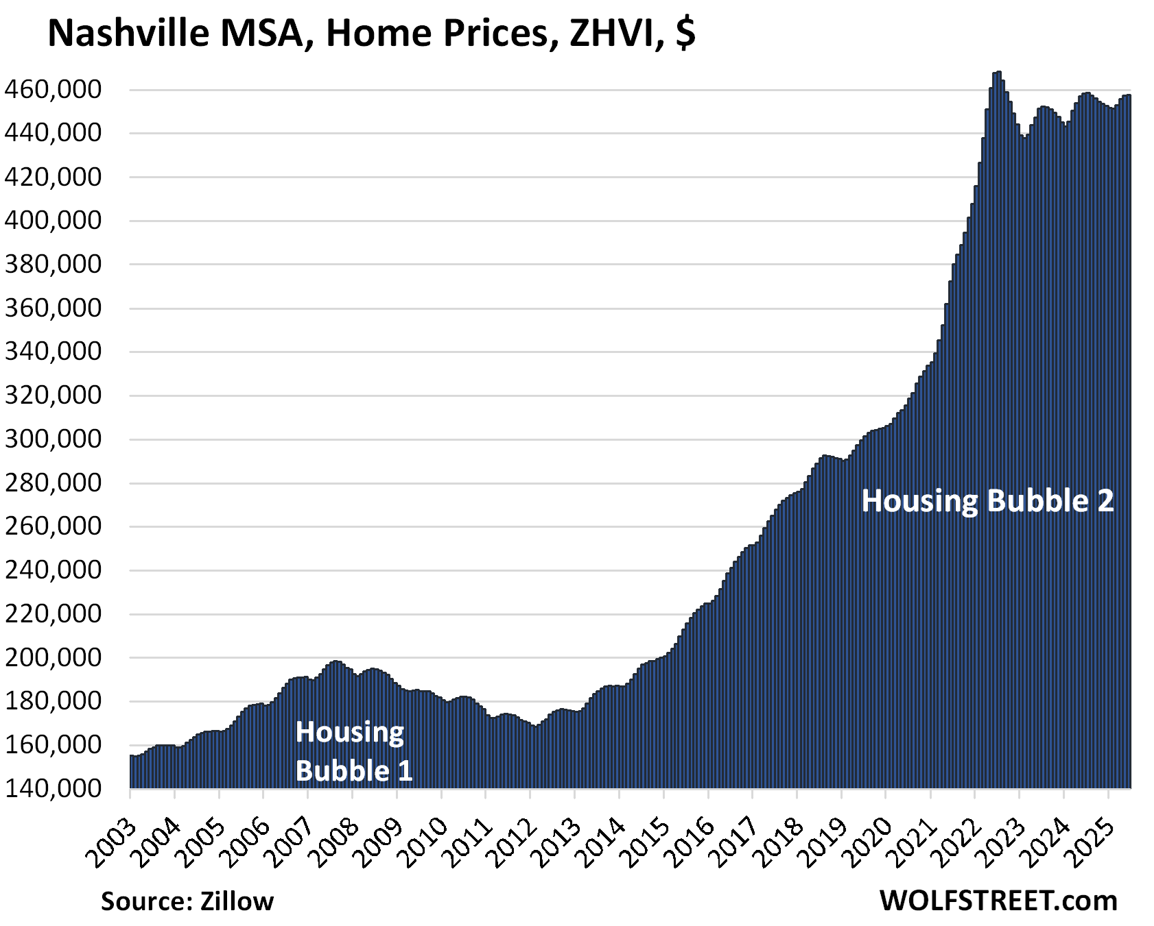 To qualify for this list, the MSA must be one of the largest by population and must have had a ZHVI of at least $300,000 at some point. Some metros that are large enough don’t qualify for this list because their ZHVI has never reached $300,000, despite the blistering surge of home prices in recent years, such as the metros of New Orleans, Memphis, Oklahoma City, Tulsa, Cincinnati, and Pittsburgh.