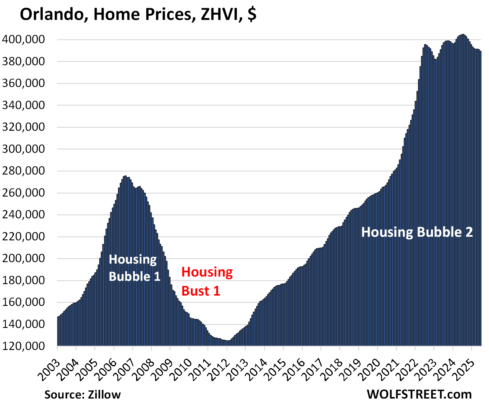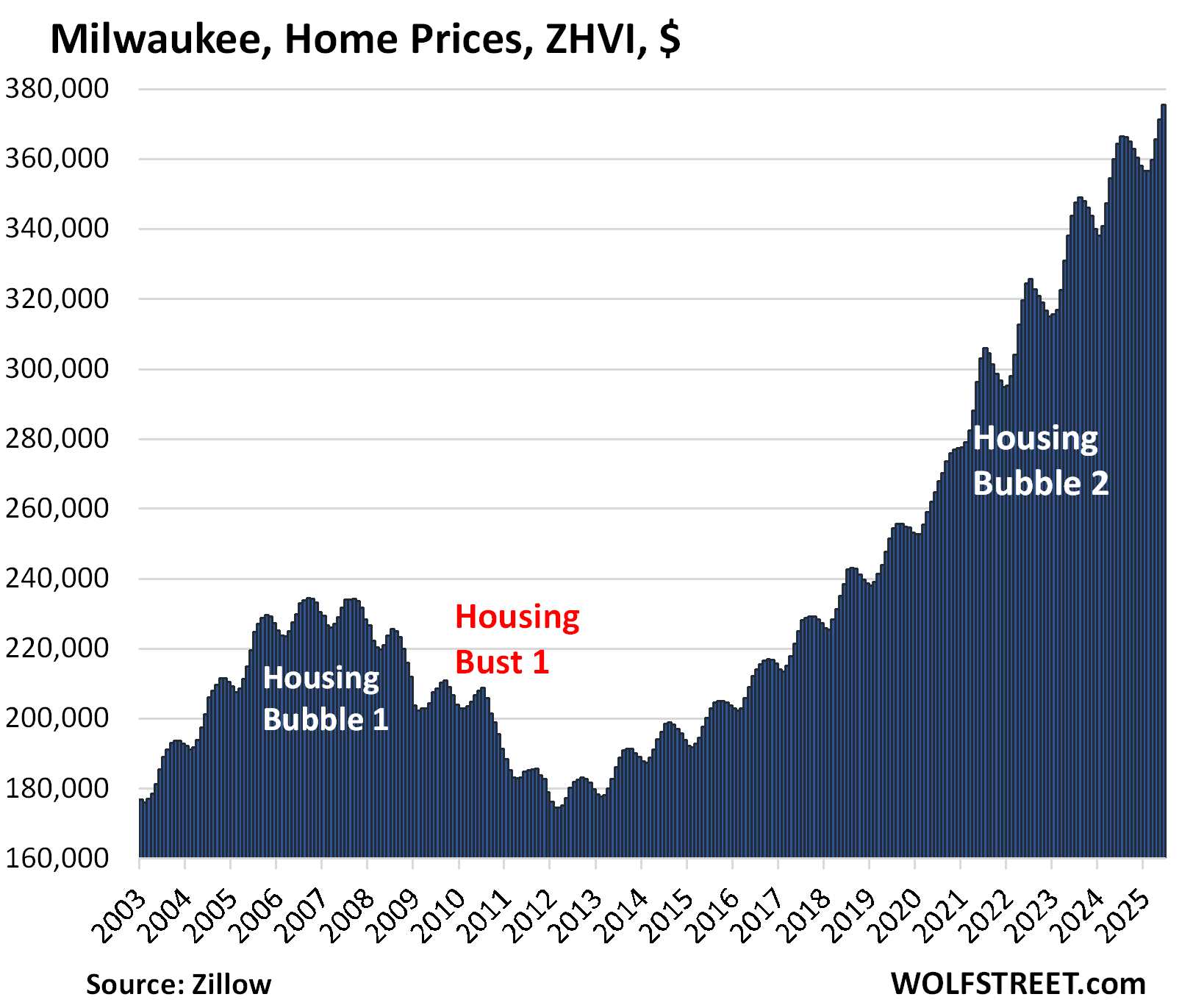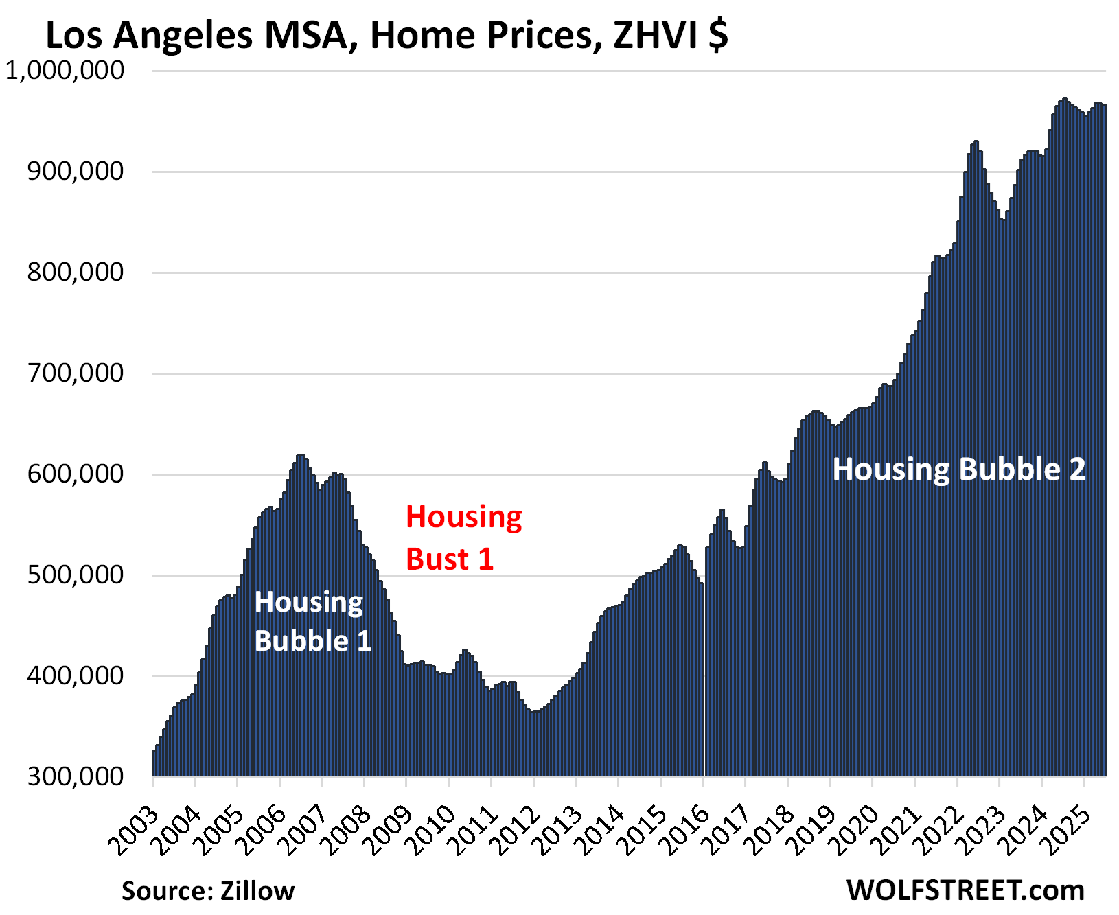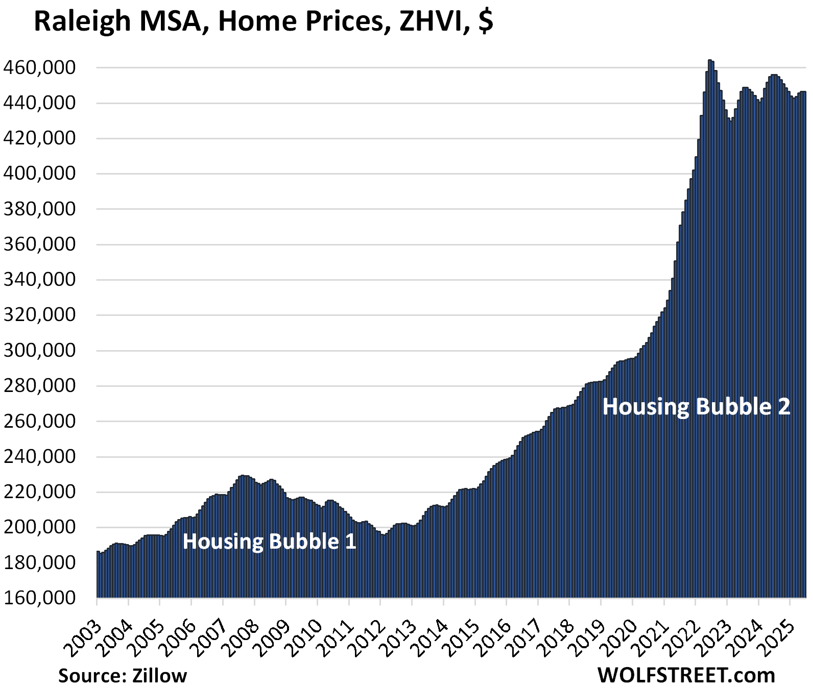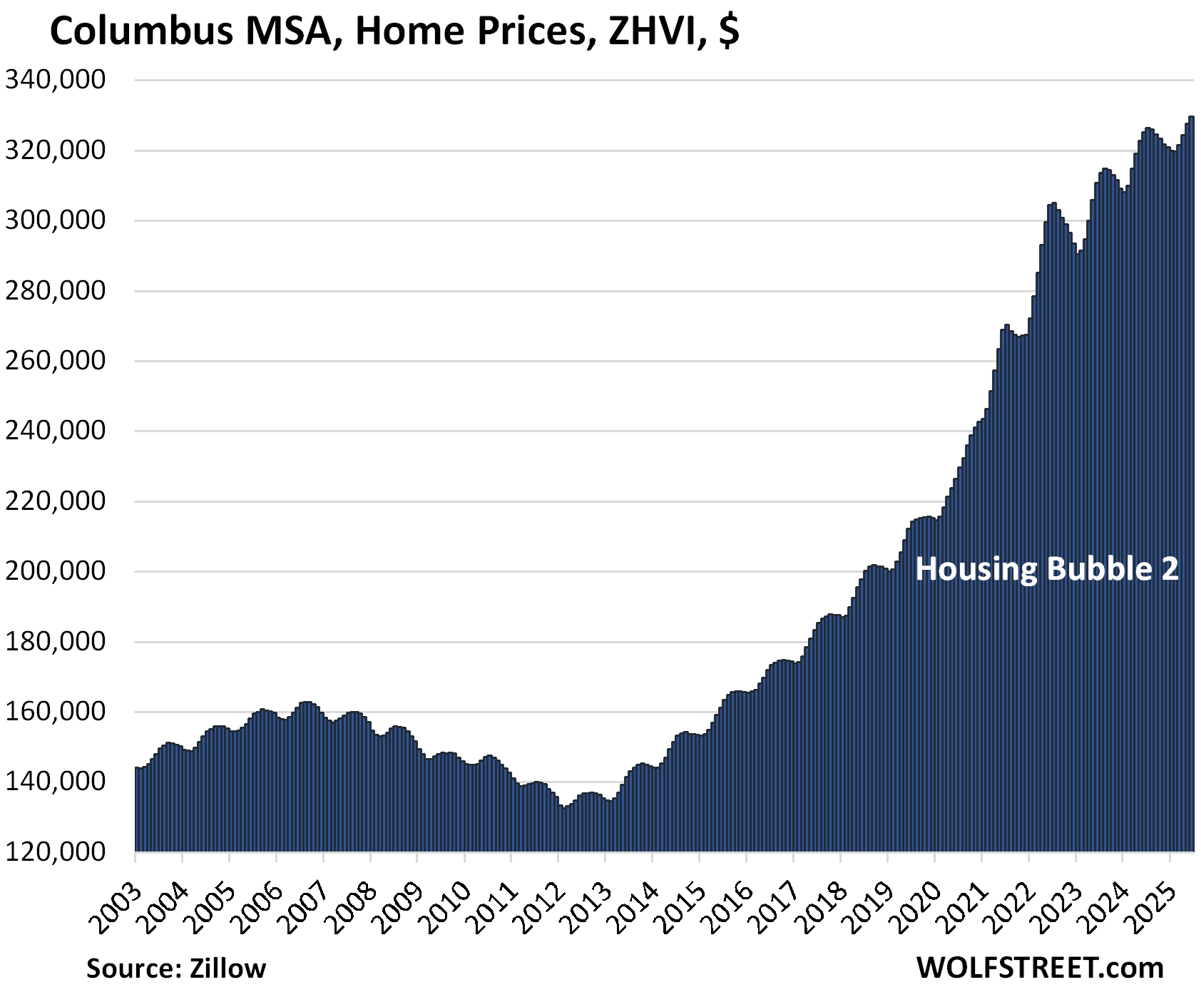 To qualify for this list, the MSA must be one of the largest by population and must have had a ZHVI of at least $300,000 at some point. Some metros that are large enough don’t qualify for this list because their ZHVI has never reached $300,000, despite the blistering surge of home prices in recent years, such as the metros of New Orleans, Memphis, Oklahoma City, Tulsa, Cincinnati, and Pittsburgh.