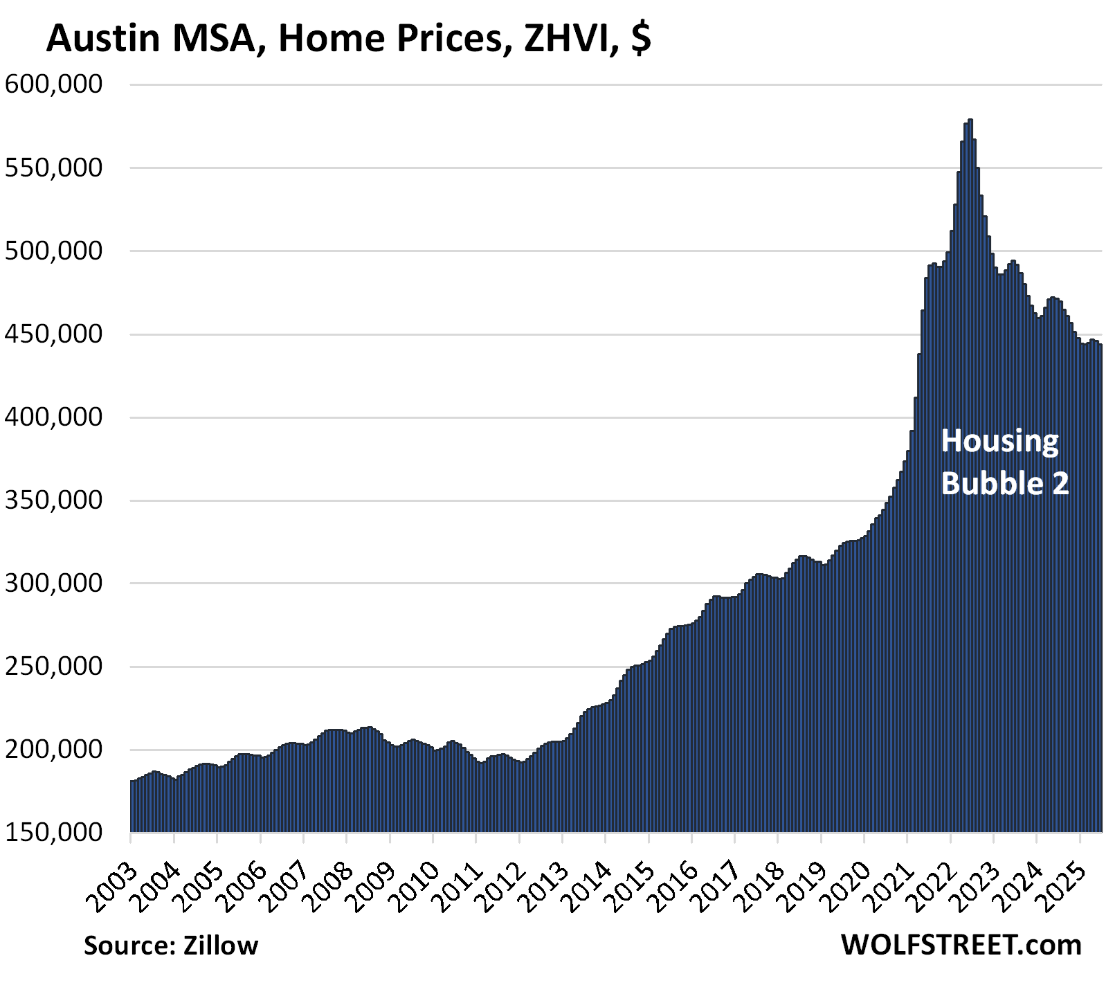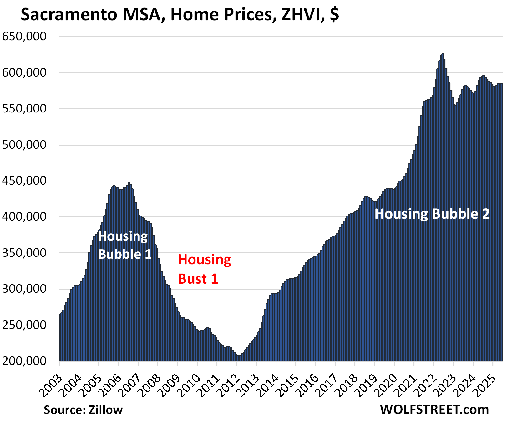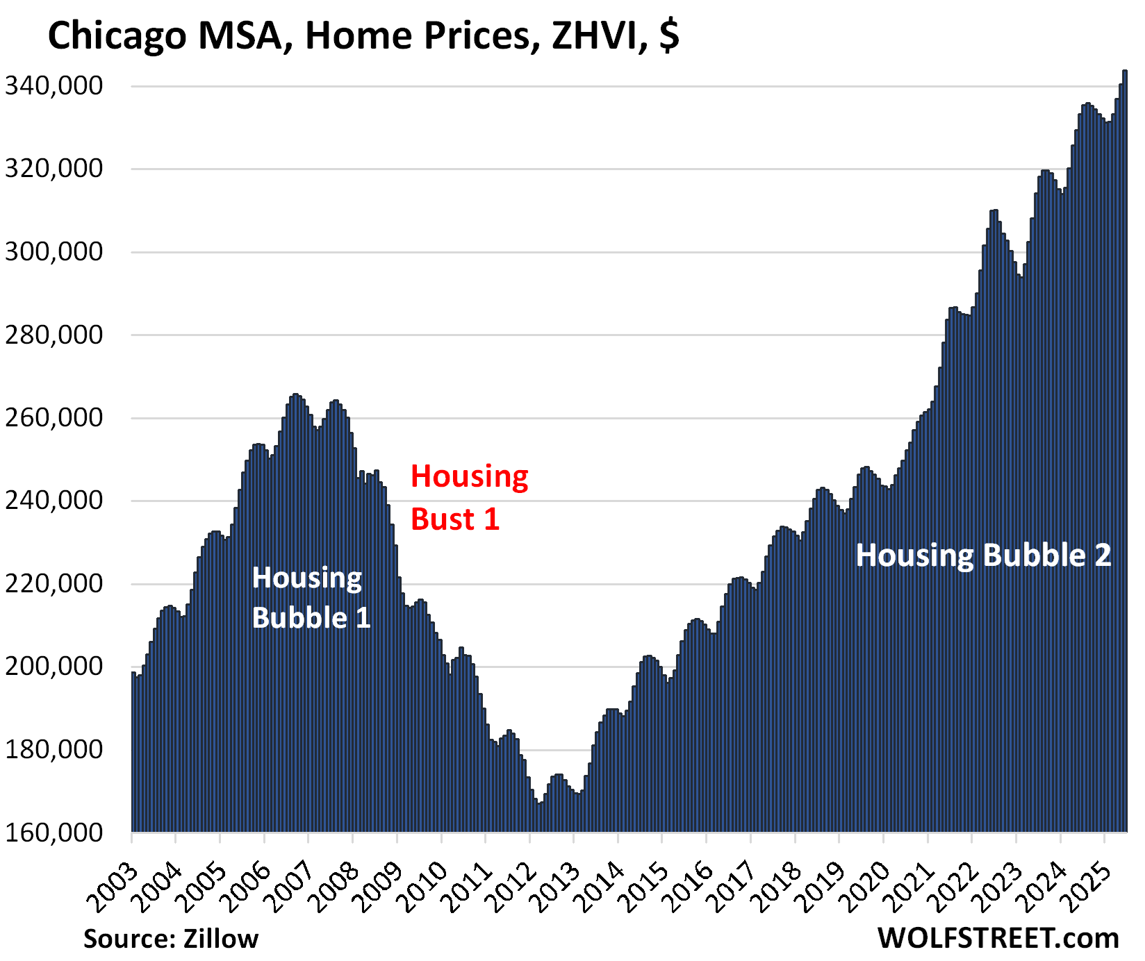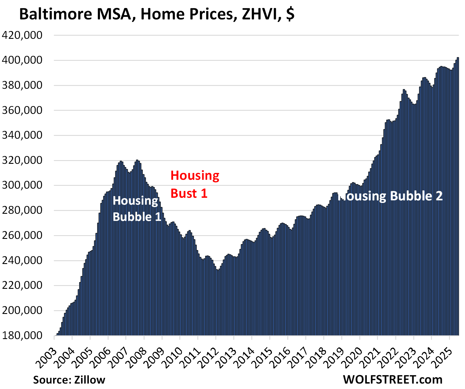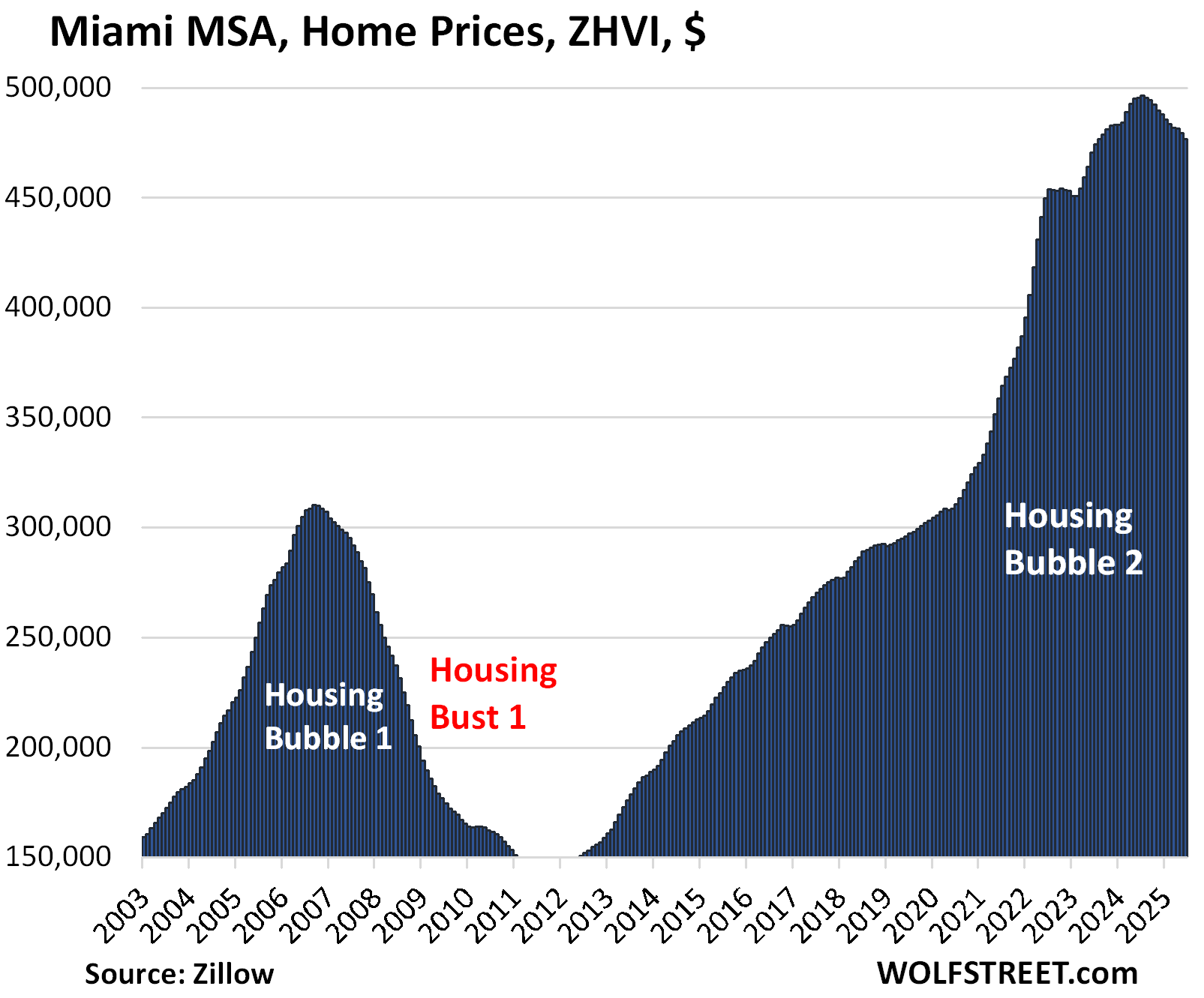 To qualify for this list, the MSA must be one of the largest by population and must have had a ZHVI of at least $300,000 at some point. Some metros that are large enough don’t qualify for this list because their ZHVI has never reached $300,000, despite the blistering surge of home prices in recent years, such as the metros of New Orleans, Memphis, Oklahoma City, Tulsa, Cincinnati, and Pittsburgh.