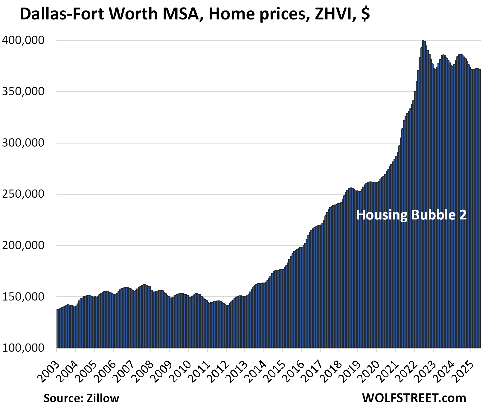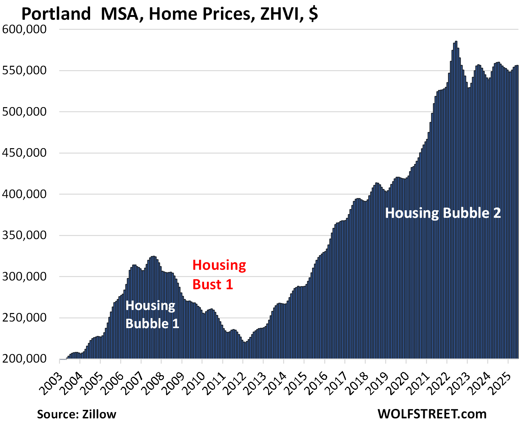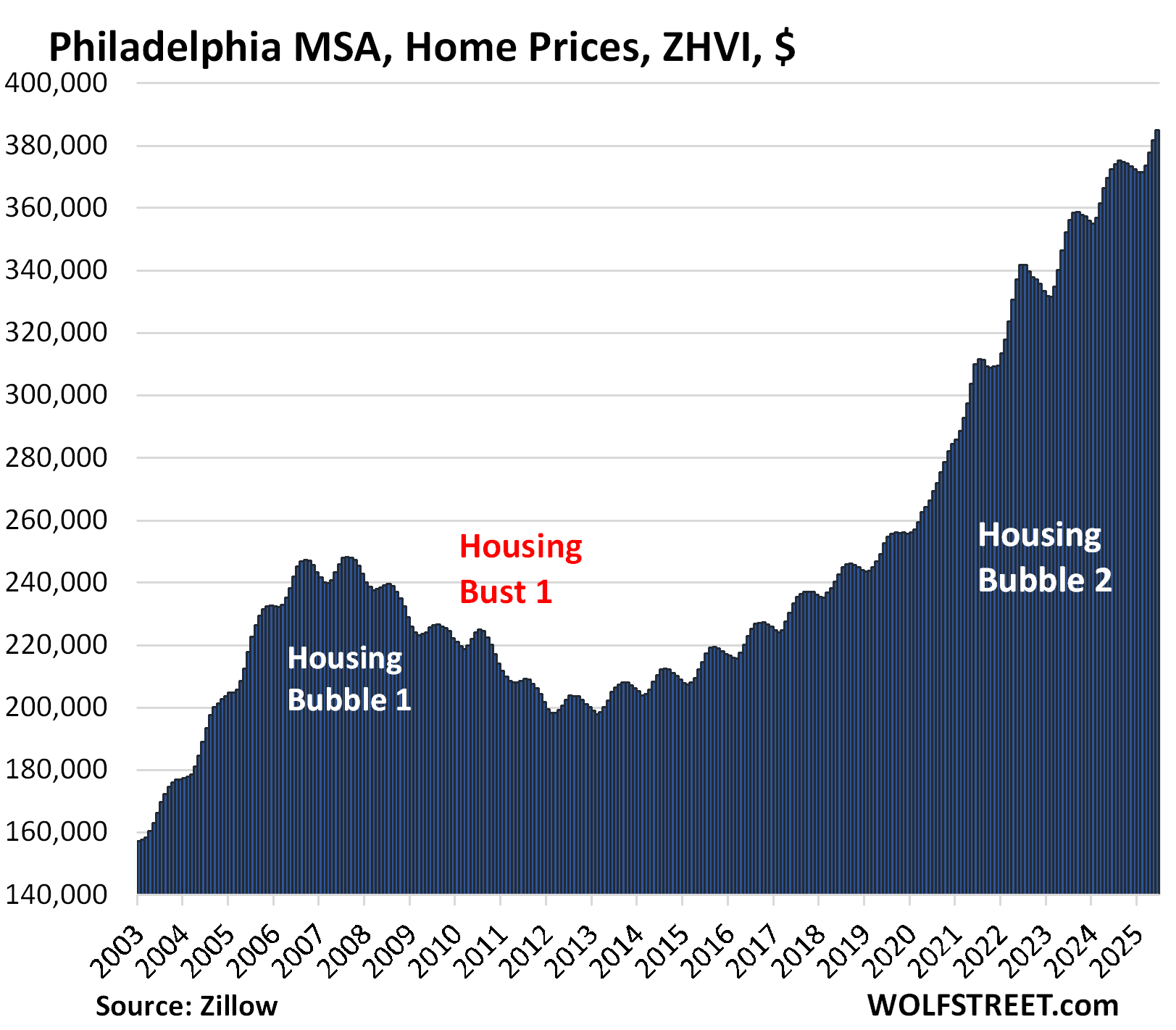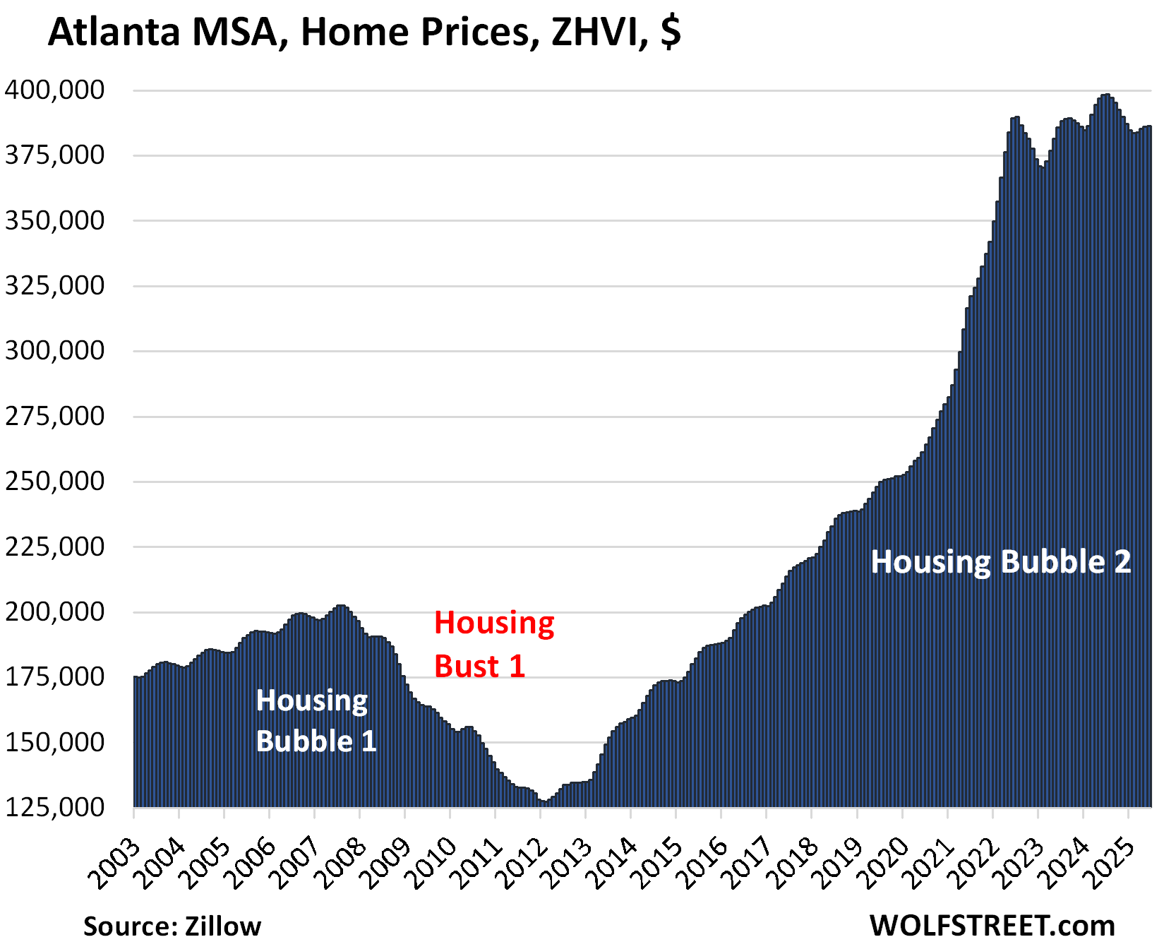 To qualify for this list, the MSA must be one of the largest by population and must have had a ZHVI of at least $300,000 at some point. Some metros that are large enough don’t qualify for this list because their ZHVI has never reached $300,000, despite the blistering surge of home prices in recent years, such as the metros of New Orleans, Memphis, Oklahoma City, Tulsa, Cincinnati, and Pittsburgh.