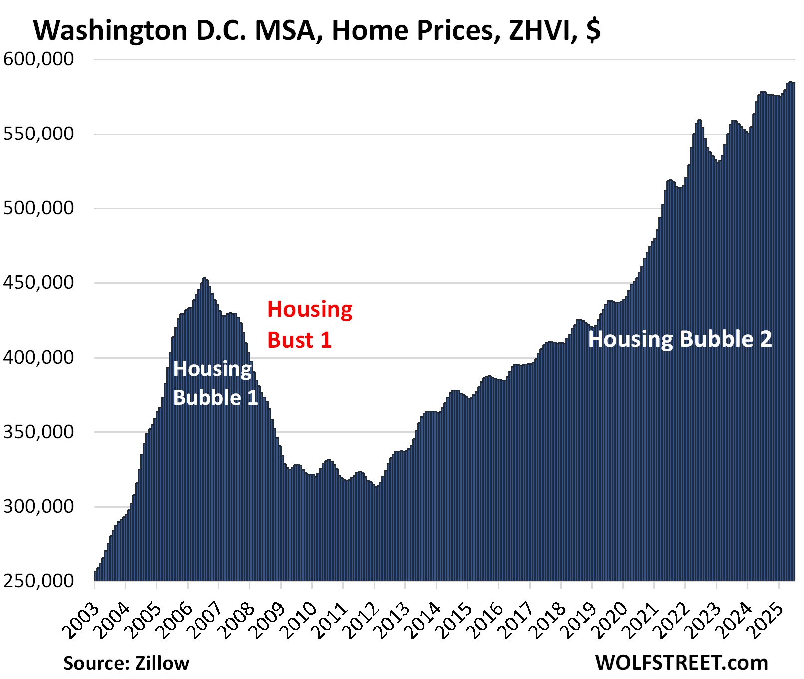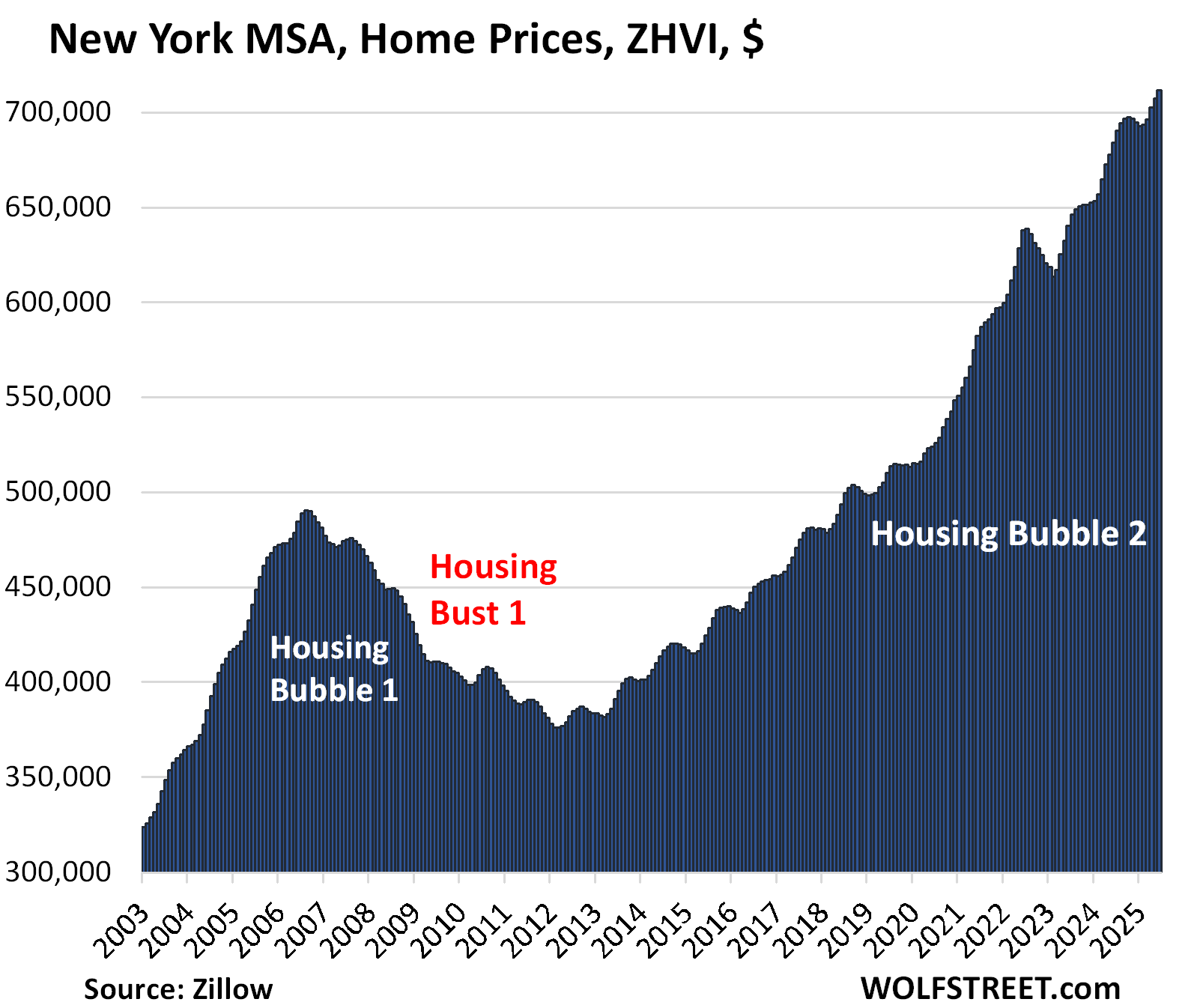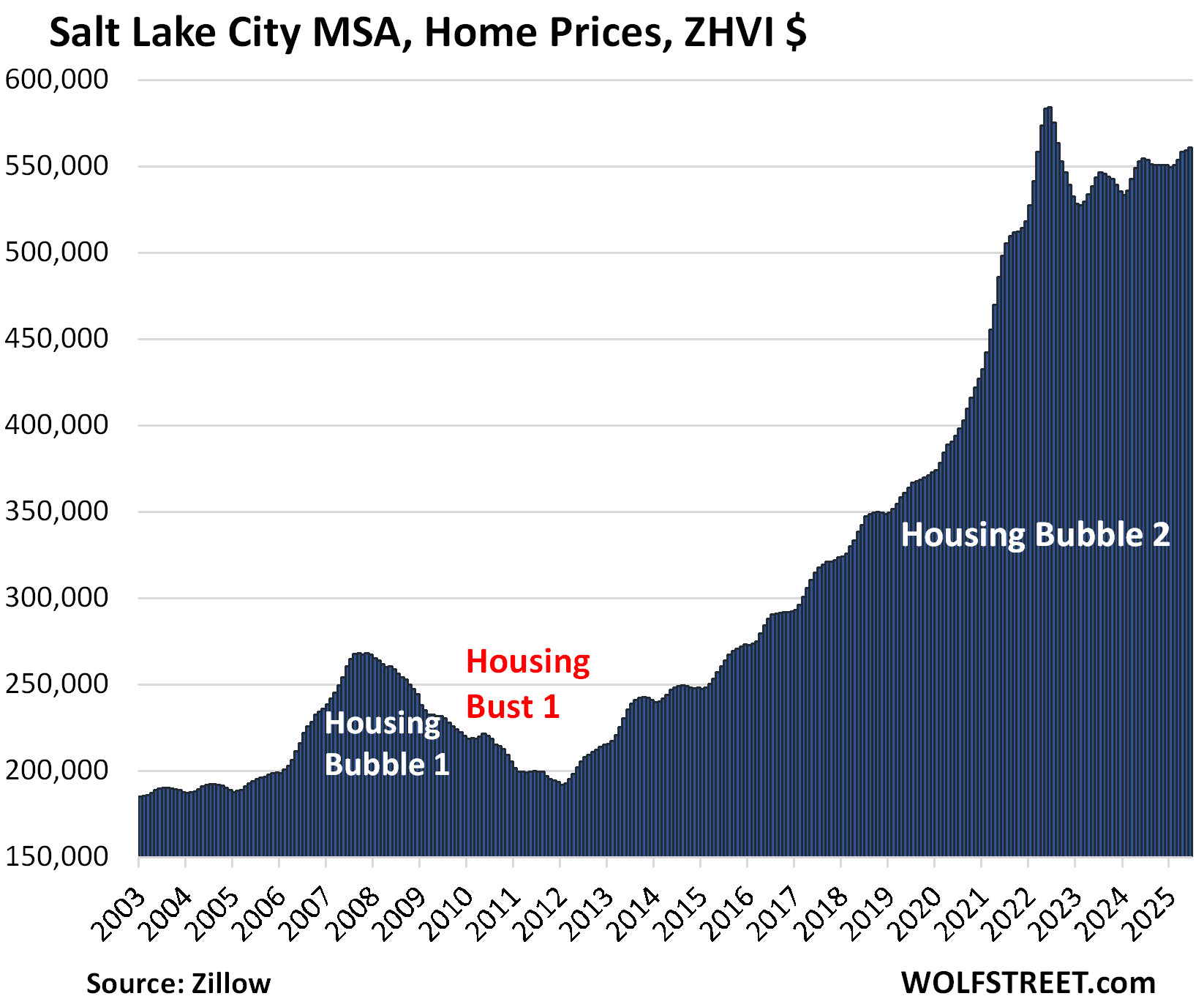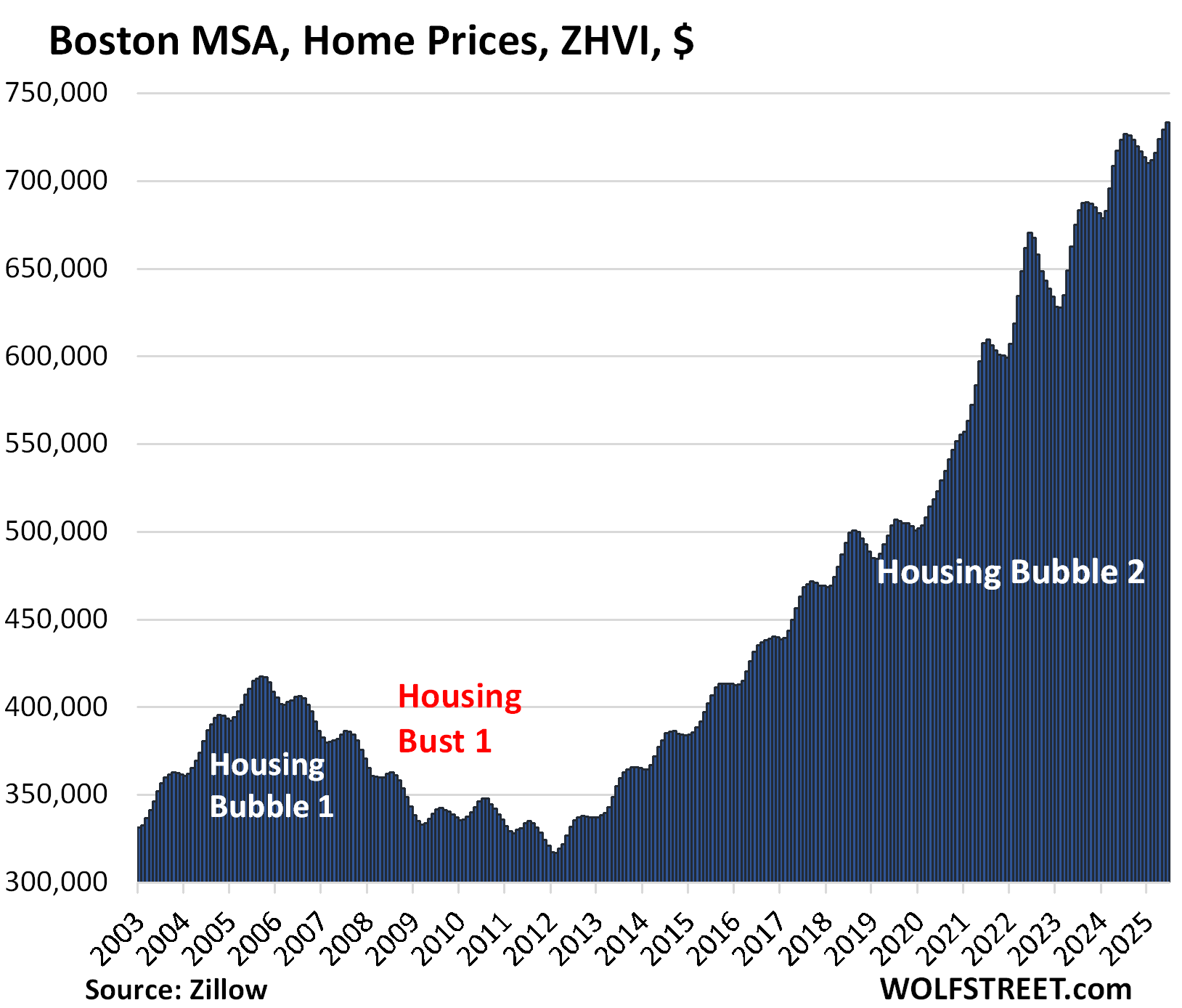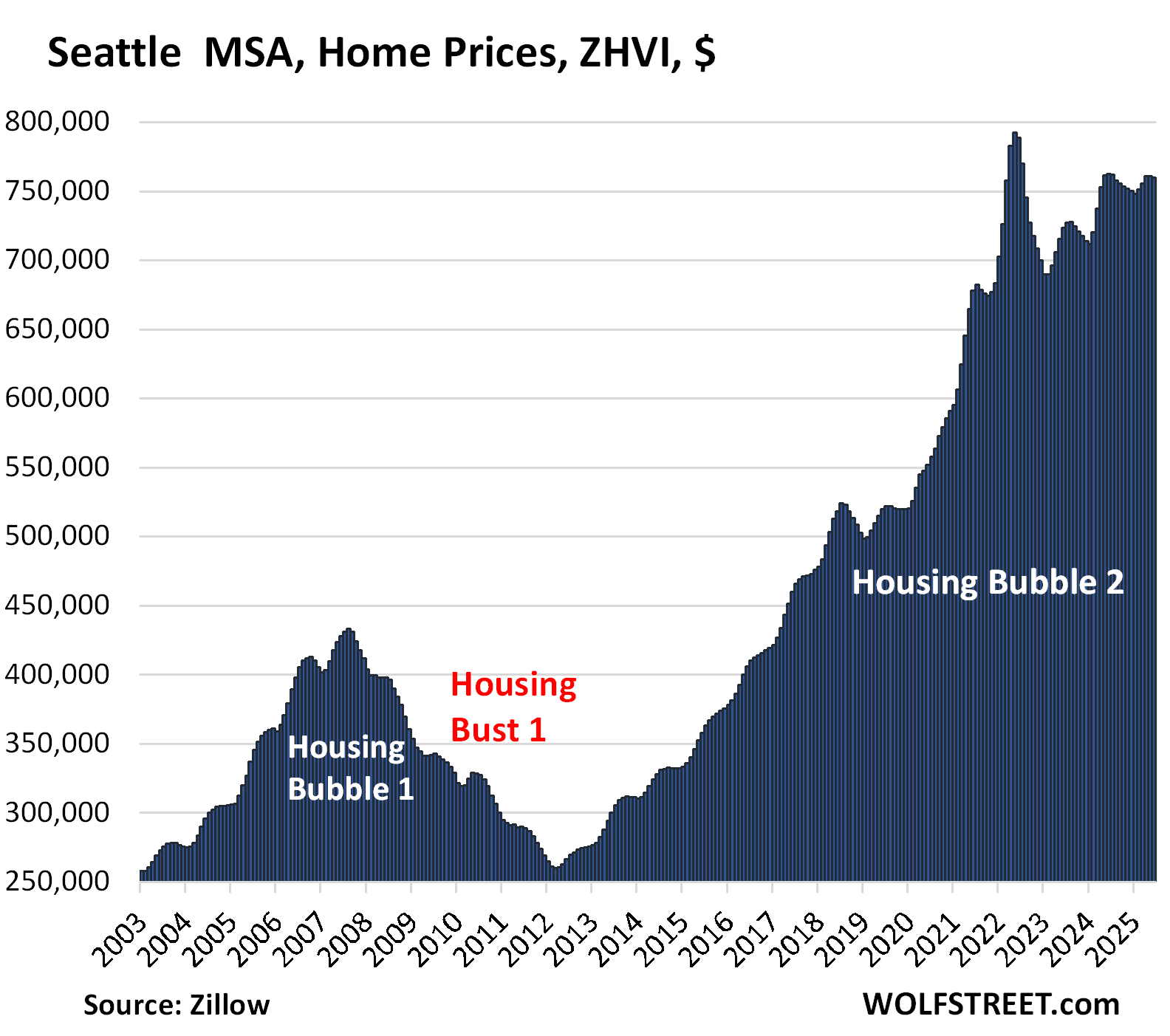 To qualify for this list, the MSA must be one of the largest by population and must have had a ZHVI of at least $300,000 at some point. Some metros that are large enough don’t qualify for this list because their ZHVI has never reached $300,000, despite the blistering surge of home prices in recent years, such as the metros of New Orleans, Memphis, Oklahoma City, Tulsa, Cincinnati, and Pittsburgh.