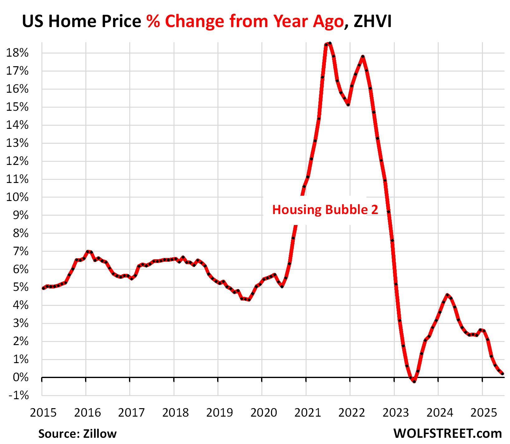 The year-over-year price gains of mid-tier single-family homes, condos, and co-ops in the US nearly vanished in June: prices rose by just 0.2% compared to June a year ago. But that wasn’t equally spread around.