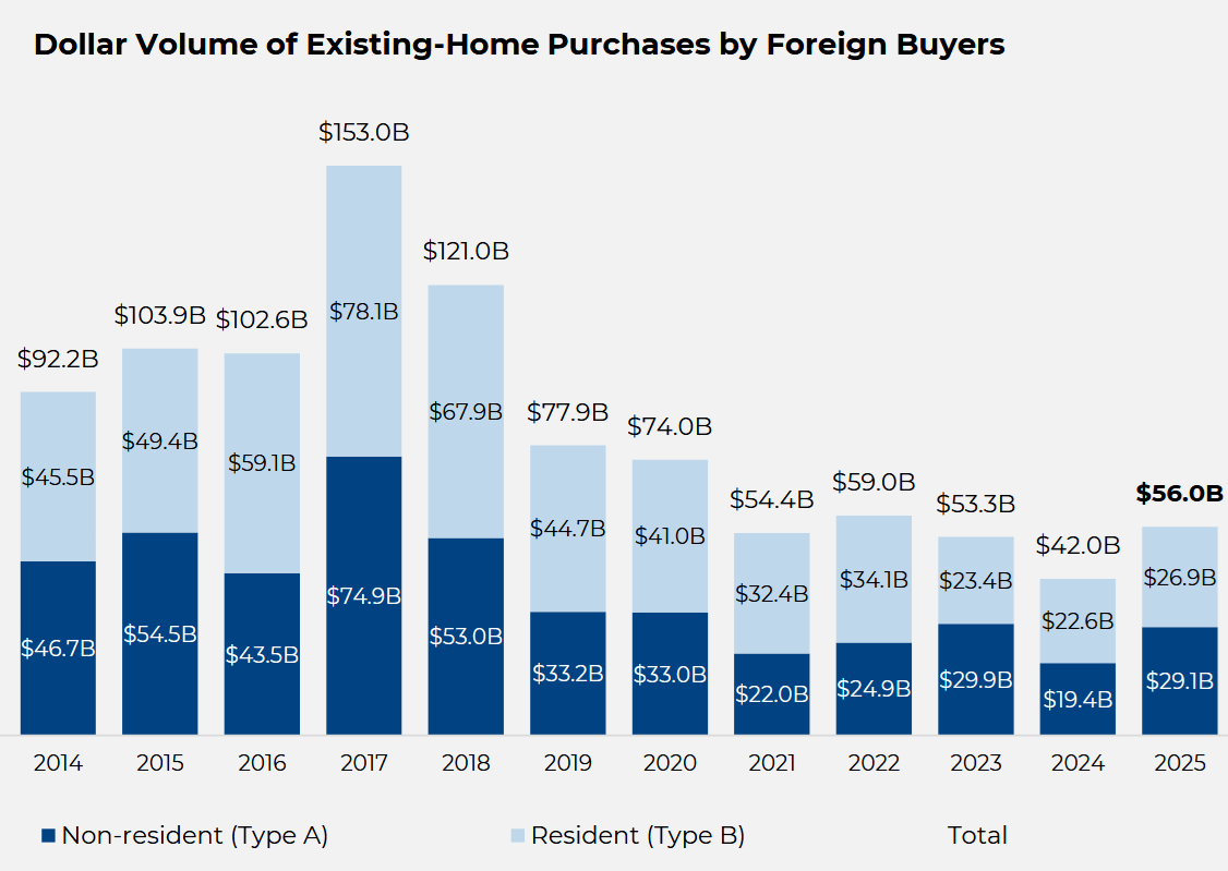 $56 billion a “record”??? LOL, that’s a big-fat malicious LIE. Purchases in dollar terms collapsed by 63% in 2025 from the ACTUAL RECORD year, 2017, when foreign buyers bought $153 billion in homes. In 2018, they bought $121 billion. There were four years with over $100 billion in purchases.