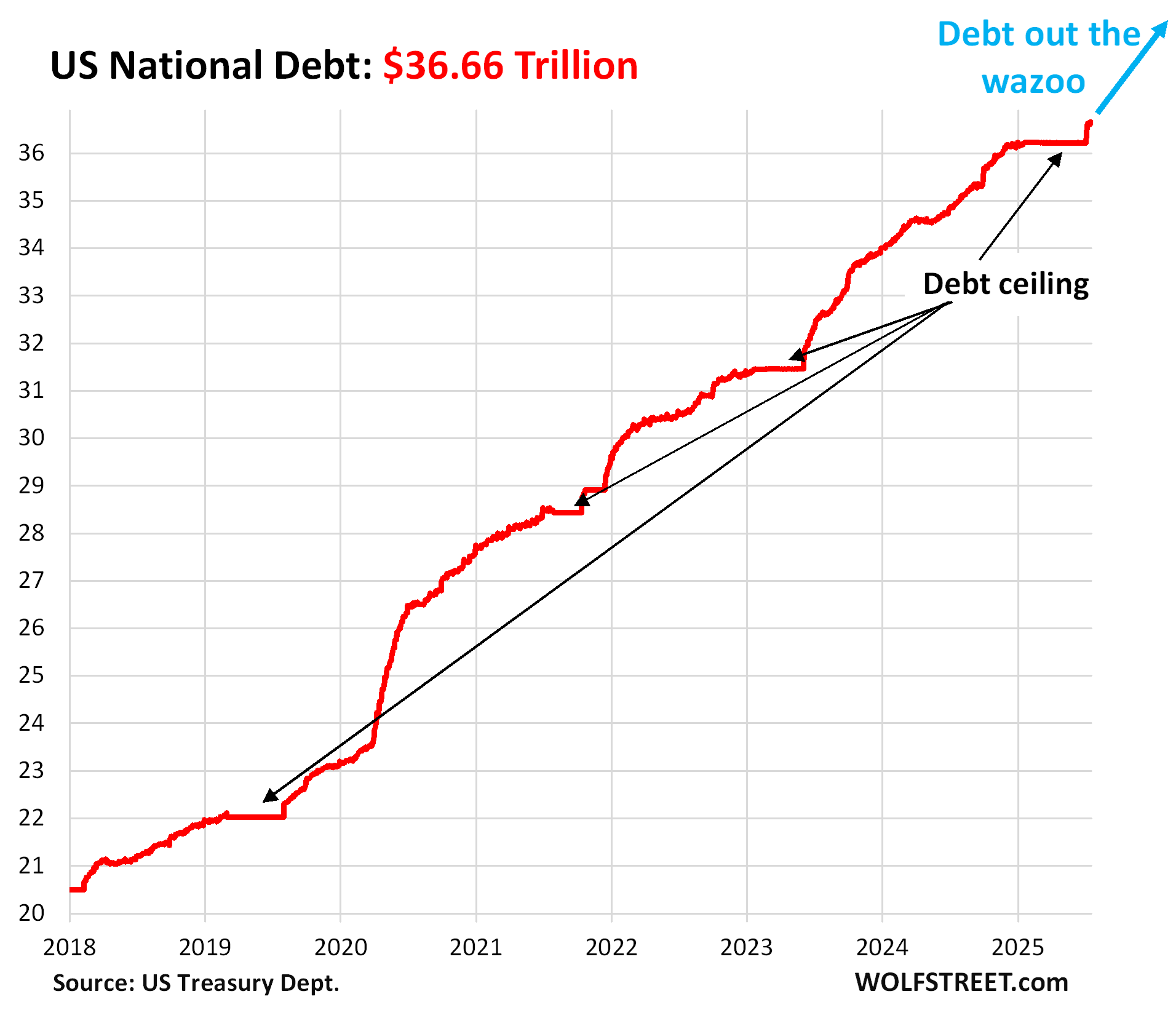 The recklessly ballooning US national debt has surged by $441 billion in the two weeks since the debt ceiling was lifted, and by $1.71 trillion in 12 months, to $36.66 trillion. How this debt will blow out during the next recession when tax receipts plunge and expenditures explode is not anything we’d want to even think about.