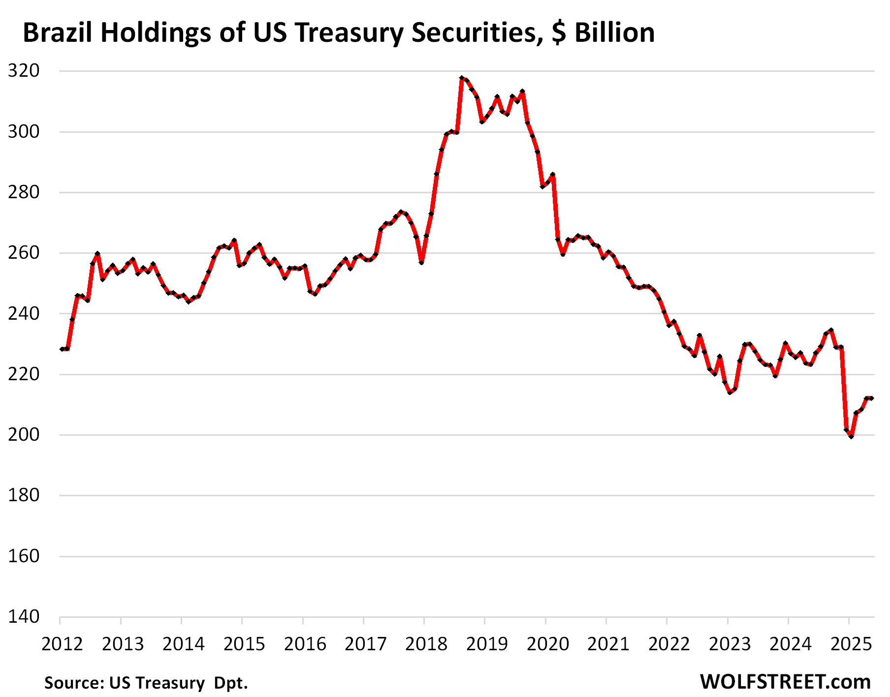 Brazil’s holdings were roughly unchanged at $212 billion in May, and down by $11 billion year-over-year. Since the peak in 2018, its holdings have fallen by one-third: